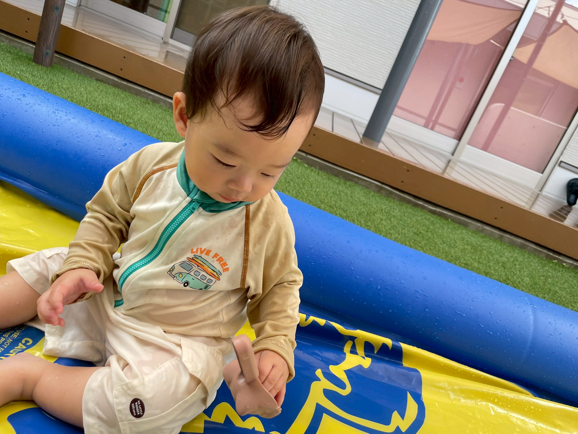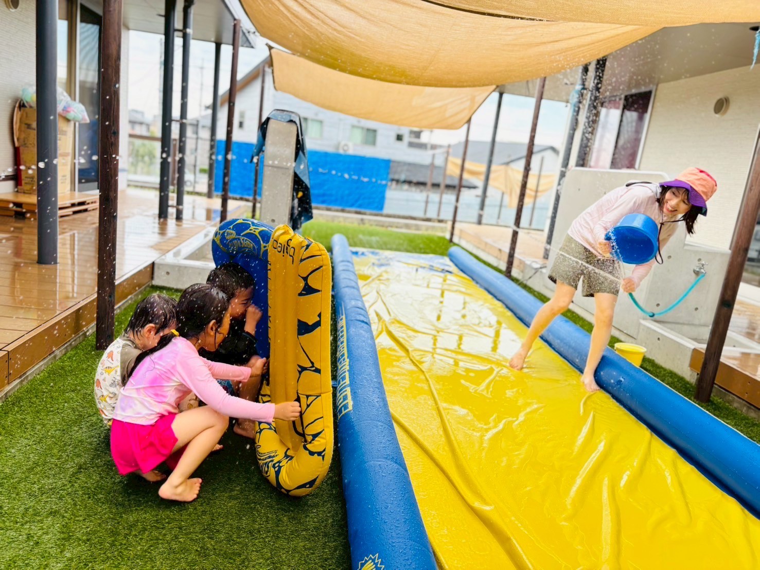 みんなで大好きな水遊びをしましたよ🎶スライダーでお友達同士引っ張ってあげたり保育者と水のかけあってたっぷり遊びました🥳