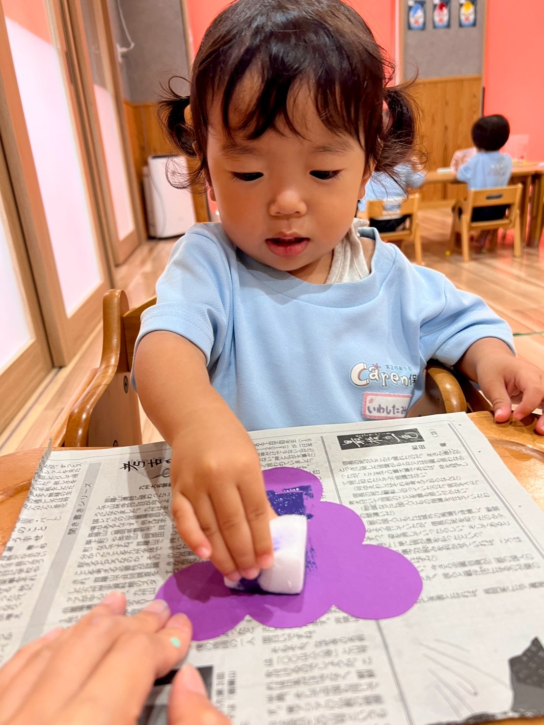 今日はパズルやポットン落としをしたあと、制作でブドウ🍇の台紙にスポンジを使って色をつけました🎨 同じ場所に繰り返し押したり、一つずつ場所を変えて丁寧に色をつけたりと、子どもたちそれぞれの表現が見られました😊