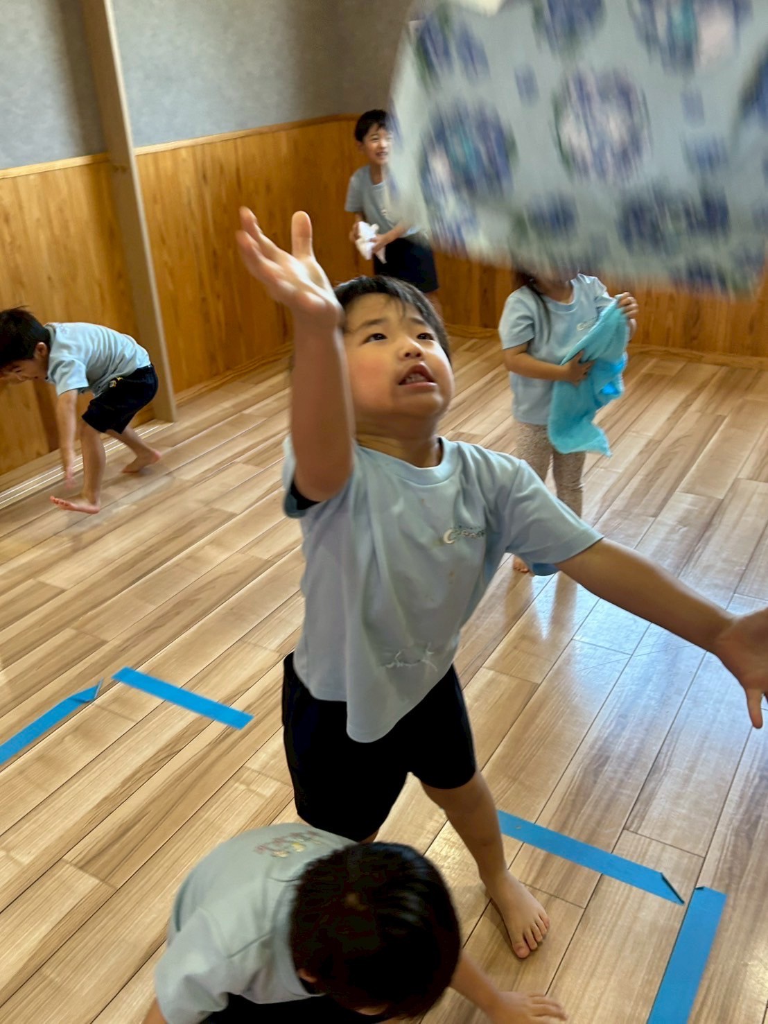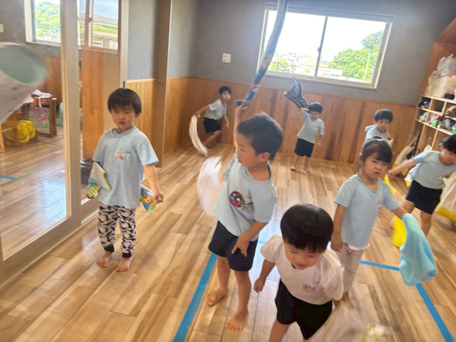 その後、🏝️サマーフェス☀️のようにタオルを回して遊びました💕音楽に合わせて、手首を動かし上や下、左右に色んな方向に回していき楽しみました☺️回し慣れていない為、違う方向に回すのを意外と苦戦していました🤣上に投げキャッチもして楽しみました⭐️きりん組🦒