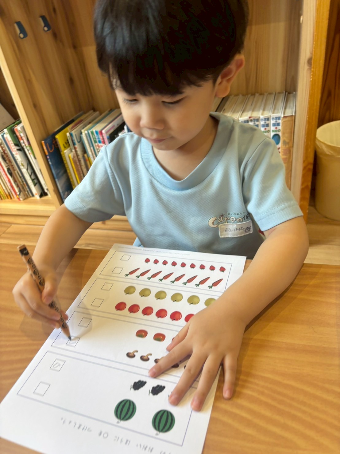 その後は影の絵を見て同じもの同士を線で結んでいきました🥰一つ一つ違いを確認しながら探していましたよ✨こあらさんは「かんたーん」と言ってどんどん進めていました🤗迷路も上手に出来ていました❣️絵を数えて多い方少ない方を○丸していきましたよ🎶見た目では分からない数の違いに苦戦するうさぎさんでした‼️