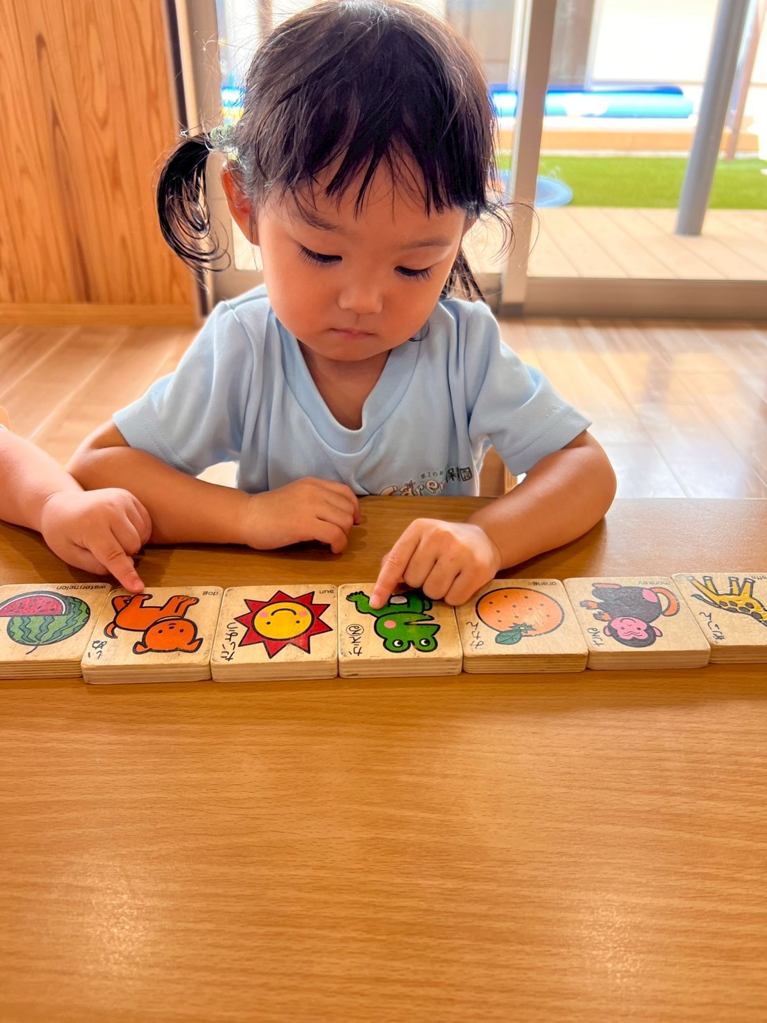 その後は絵が描かれている積み木で遊びました!積み重ねたり並べたりするだけでなく、絵柄を使ったクイズをすると「犬はどれかな?」「みかんはどこ?」と考える姿もありました。分かるものを見つけると、指さしたり手に取ったりして嬉しそうに見せてくれましたよ😊