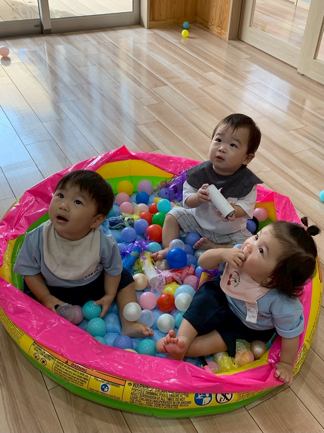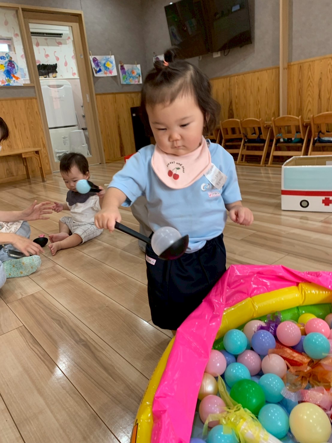 丸形と星形の入れ口や素材をお友だちと交換しながら遊びましたよ💕その後は、ビニールプールにボールをたくさん入れて、ボールすくいをしましたよ😄おままごとのお玉やトングを持って、ボールをすくったり、挟んだり❣️みんな上手にボールをすくって、カゴにポンと移していました✨