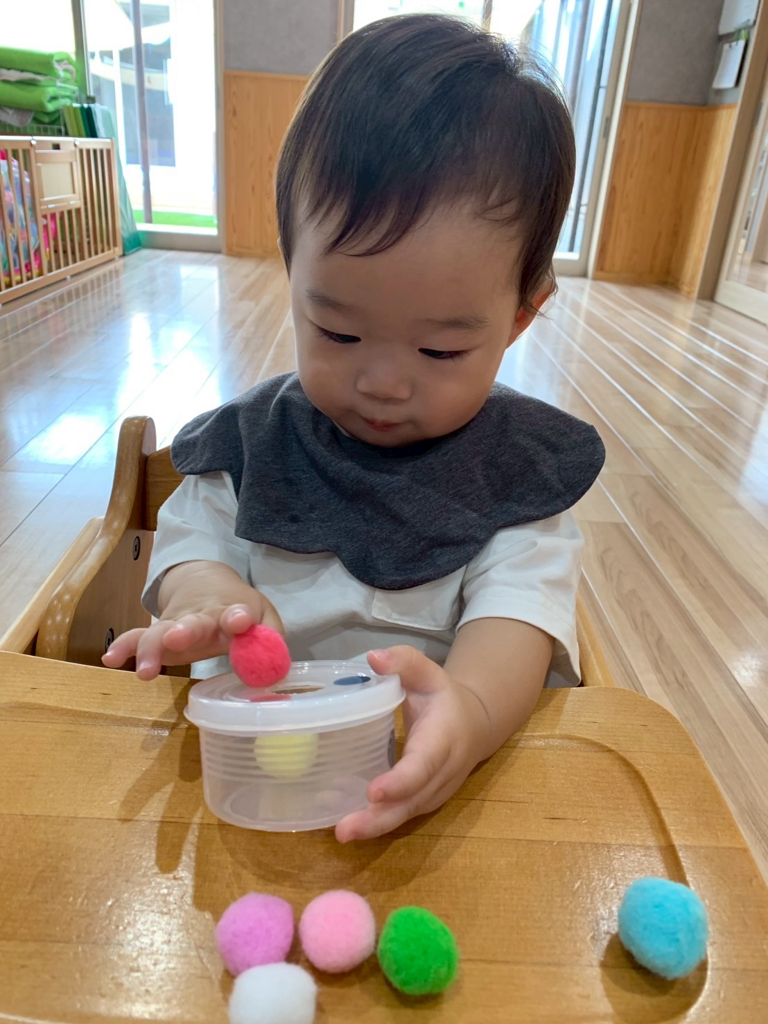 何度も繰り返し遊んでいるので、遊び方にも慣れてきて、得意げな表情で指先を使いポットンと落としていきました😊
