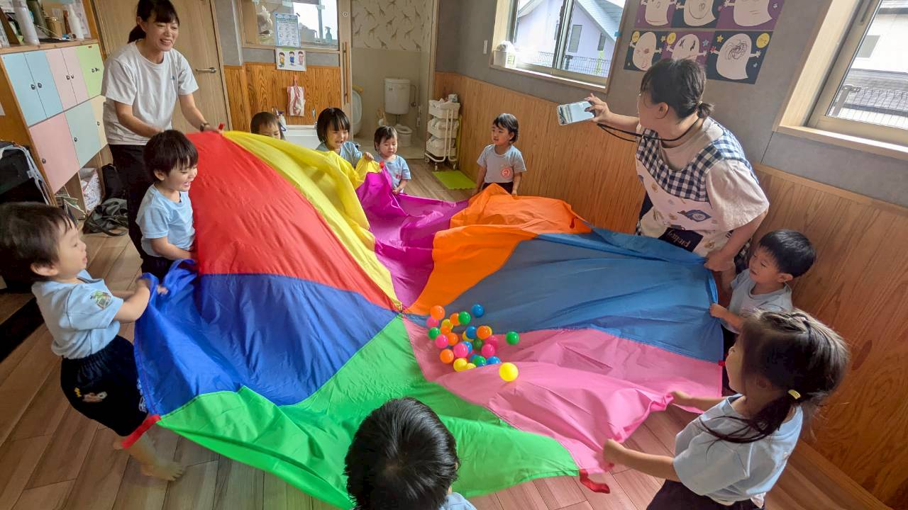 次にパラバルーンを持ってボールを打ち上げました✨タイミングがなかなか難しかったですが、子ども達は終始笑顔で盛り上がっていましたよ😆💓