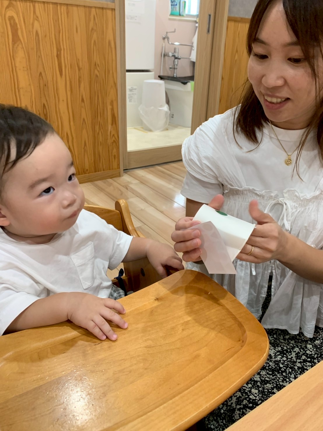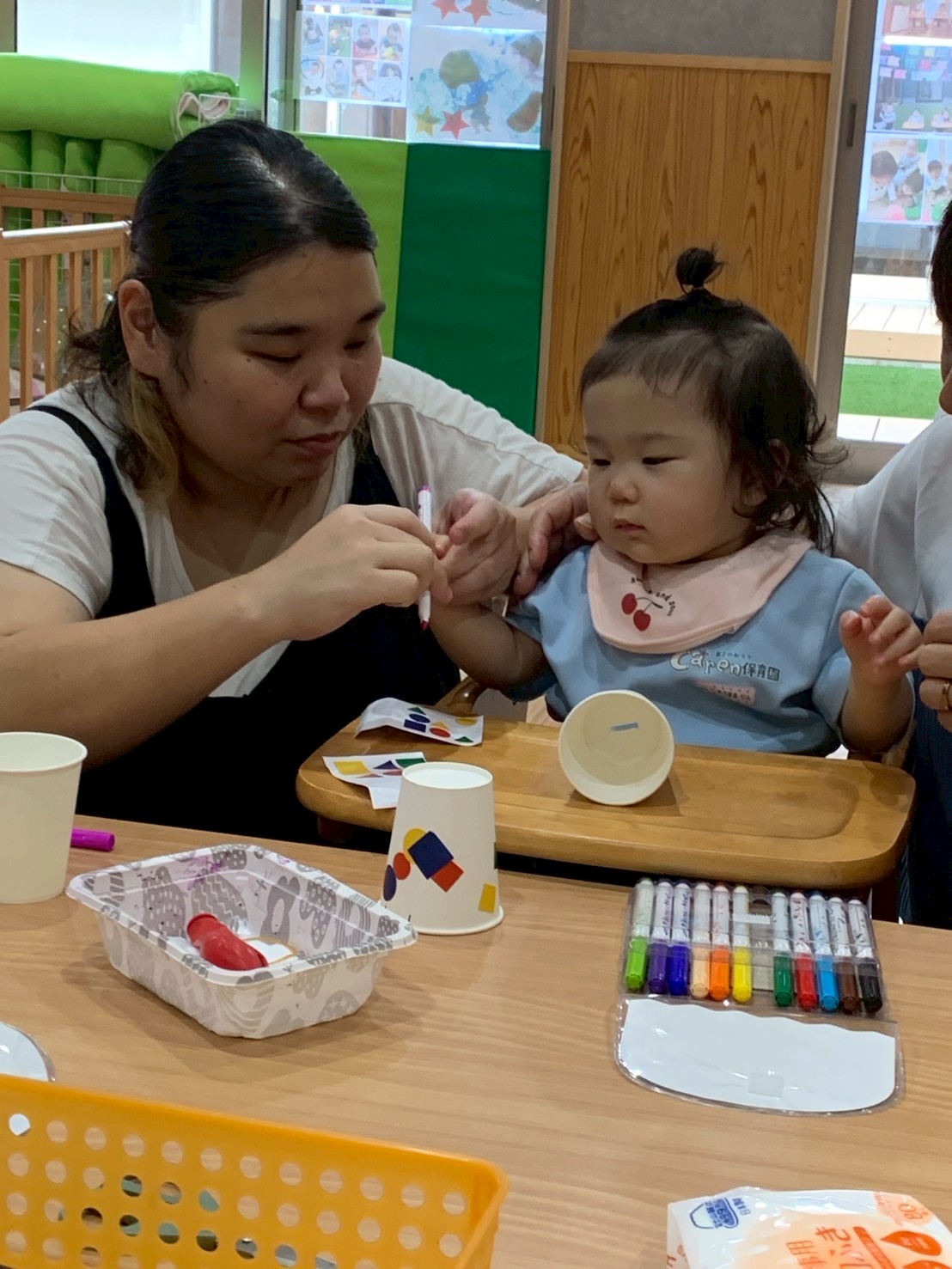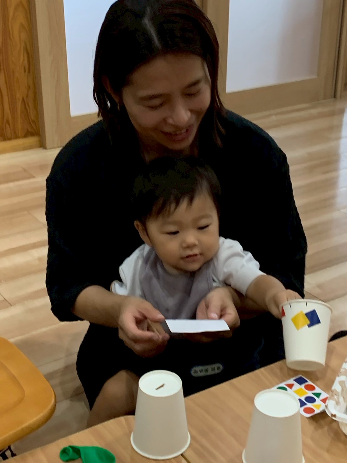 お家の方がいて嬉しくてニッコニコのひよこさんたち🐥ちょっと甘えて、ママのお膝に座って製作するお友だちもいましたよ❣️出来上がった玩具を飛ばして、「わ〜❣️」と声をあげて喜んでいました😃