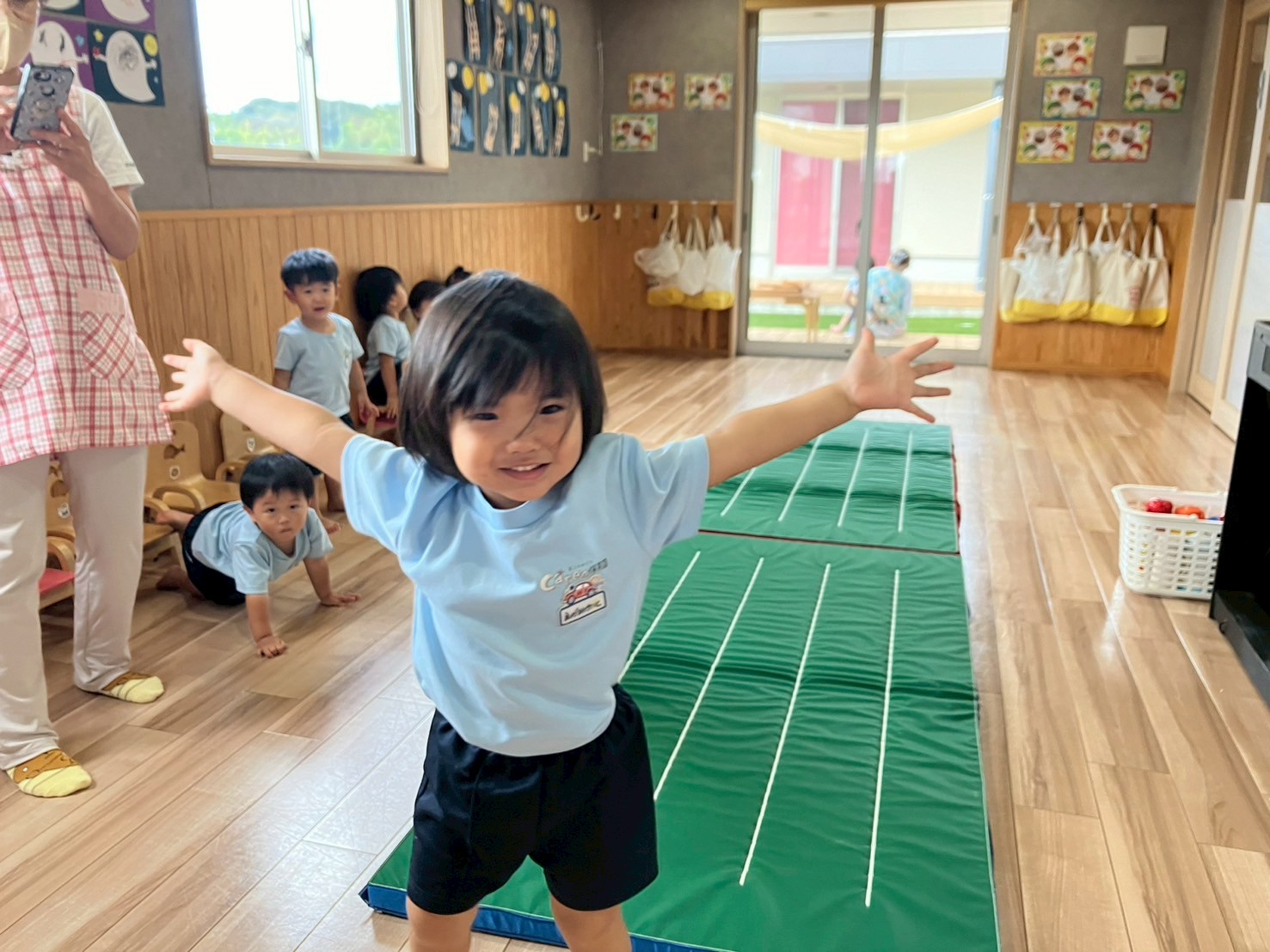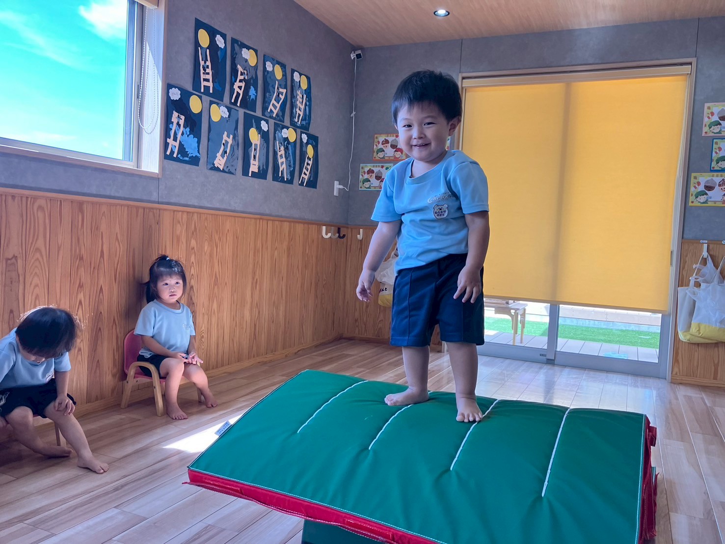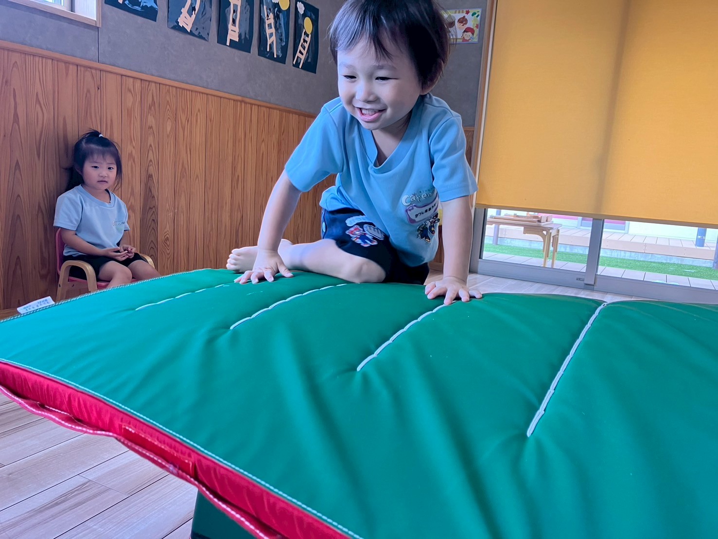 跳び箱の上にマットを乗せて山を作り、山を登ってジャンプにも大喜びで挑戦していました😆✨