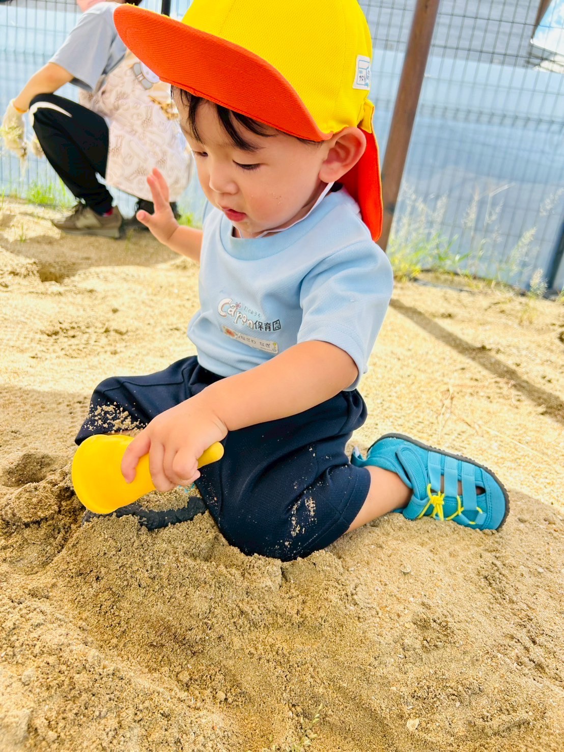 そのあとは園庭に出て砂場遊びをしました🙌 スコップや型を使いながらアイスやご飯を作って「どうぞ!」と持ってきてくれる子もいて、夢中になって遊んでいましたよ😊