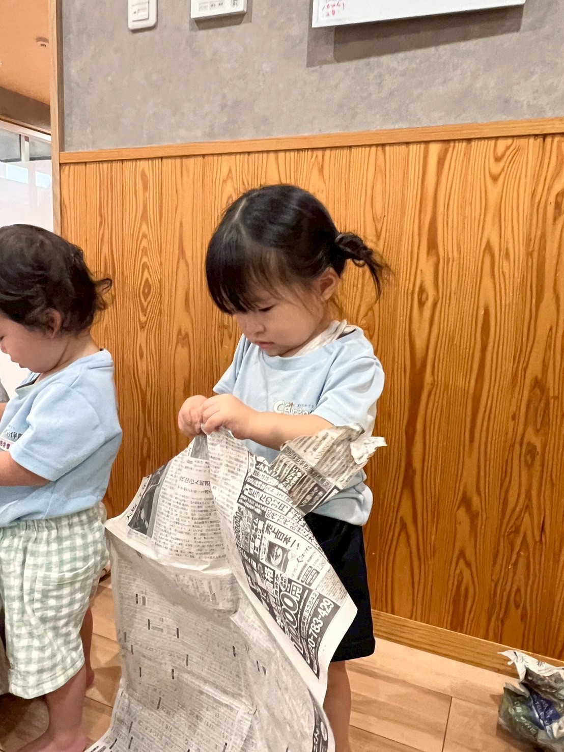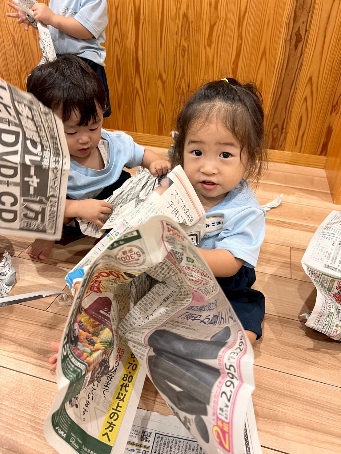 お誕生日会の後は、りす組🐿️さんと一緒に新聞紙で遊びました😃ビリビリ破ったり、くしゃくしゃ丸めたり、頭に被ったりしっぽにしたりと楽しく遊びました😄
