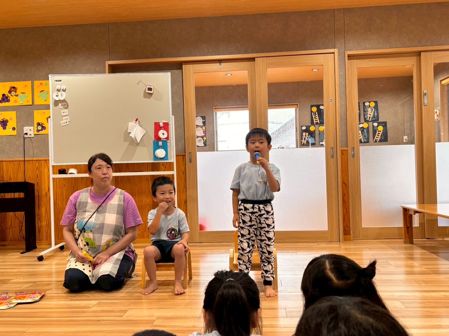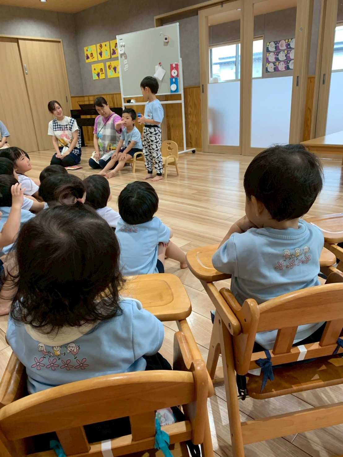 その後は先生たちの出し物で、「あたま、おしり」の言葉のクイズがあり、リズムに乗って見ていました😊リズムが心地良かったのか、眠ってしまうお友だちもいましたよ💤
