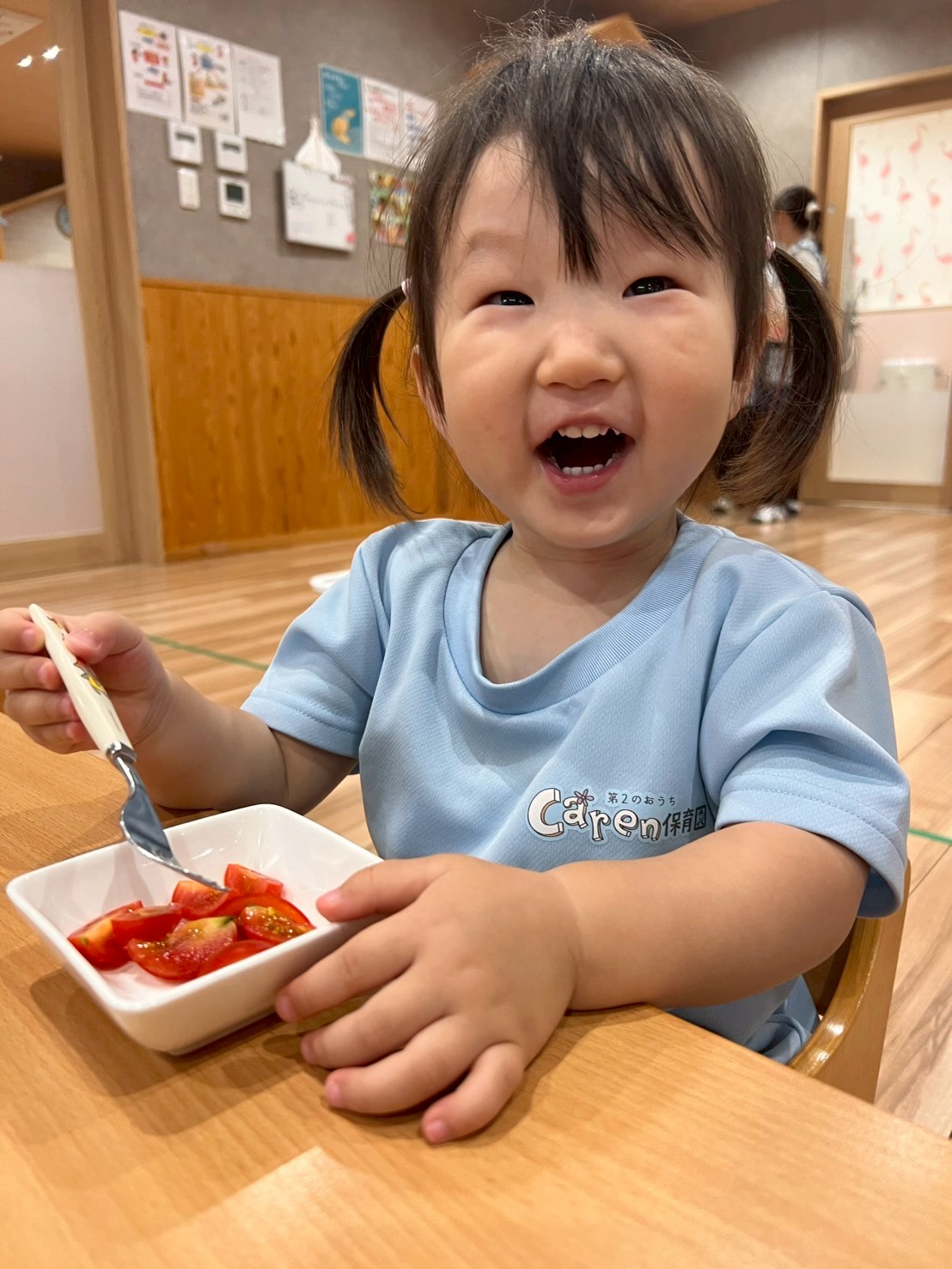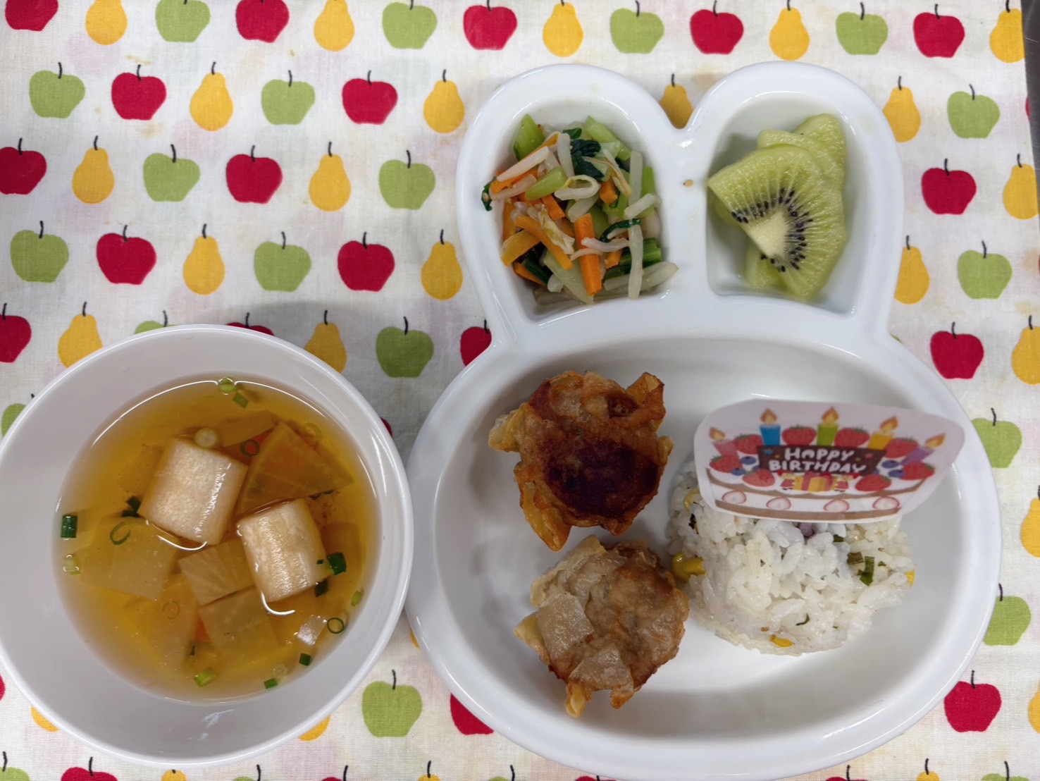 お部屋に戻ってからも少しだけあたまおしりゲームをしたり、運動遊びでカラーフープからカラーフープにボールを運ぶゲームをしました💨✨速さと丁寧さが必要なゲームでとっても盛り上がりましたよ🥴✨【くりえいと園の今日の給食です】