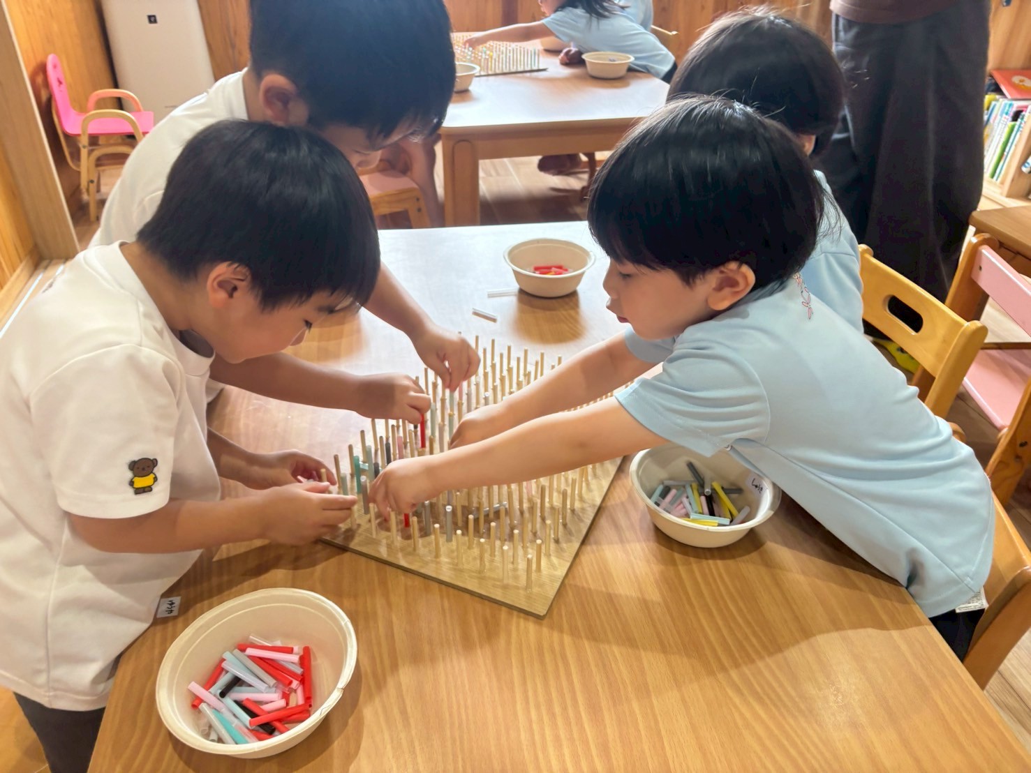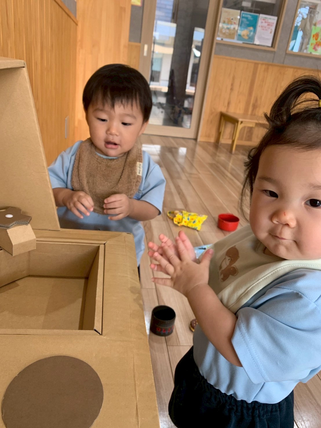 また、絵が描いてある積み木でも「これは?」と先生に聞いたり、重ねたり並べたりと夢中になって遊んでいました🧱 そのあとはひよこ組さんと一緒におままごとを楽しみましたよ🥰ぱんだ🐼ぐみ