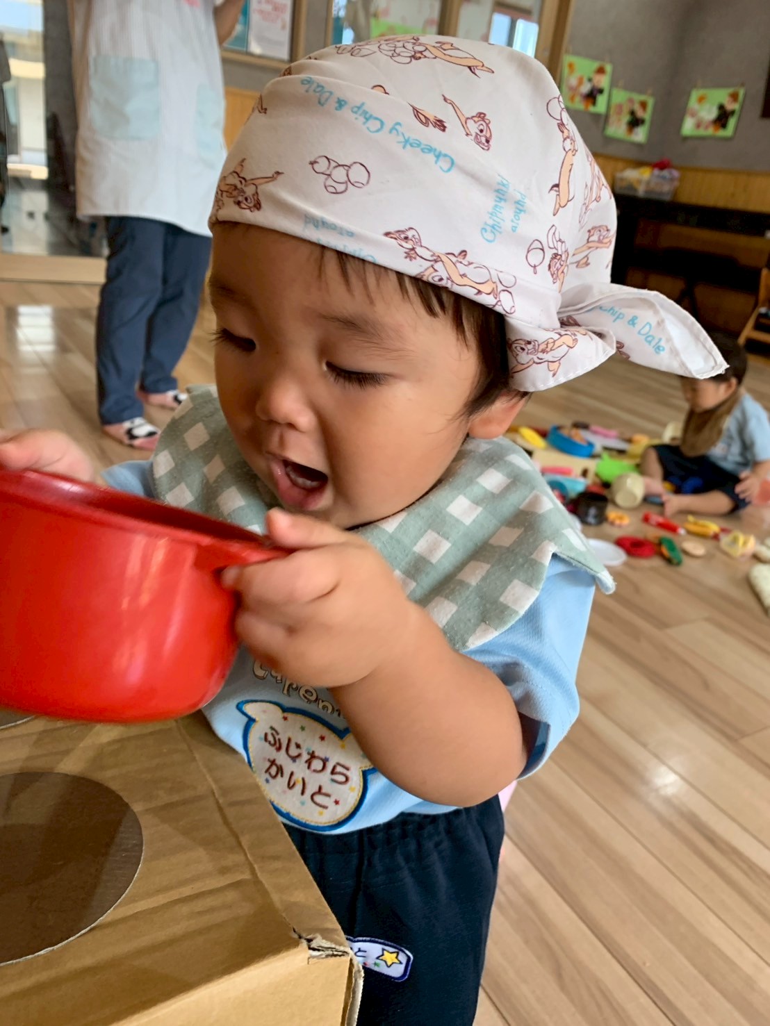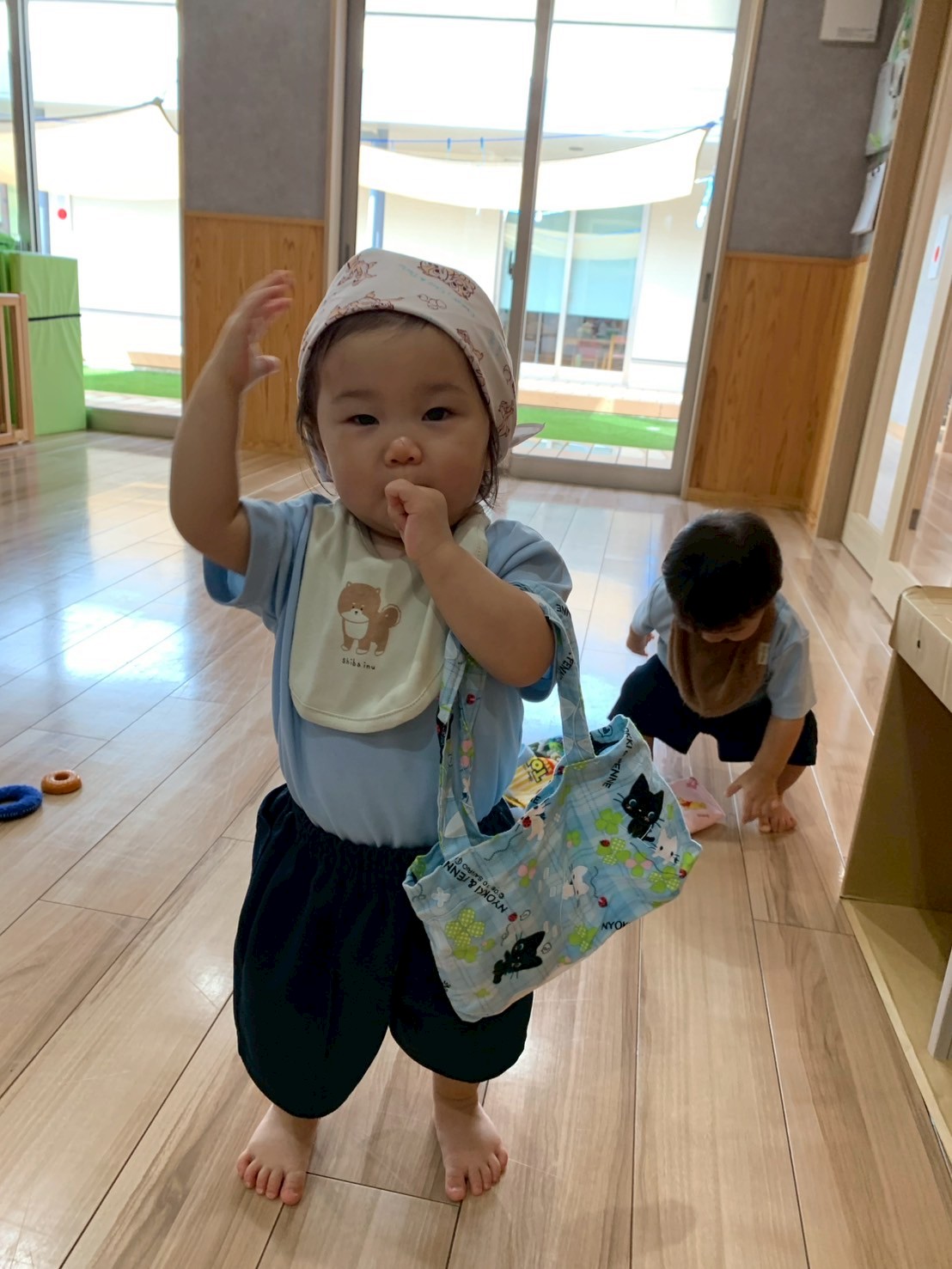 その後はおままごとをして遊びましたよ🍙バンダナを頭に巻いたり、バックを持ってお買い物したり、キッチン台でお皿を洗ってみたり、ママになりきって遊びを楽しんでいました🥰りす