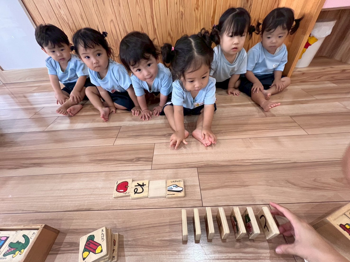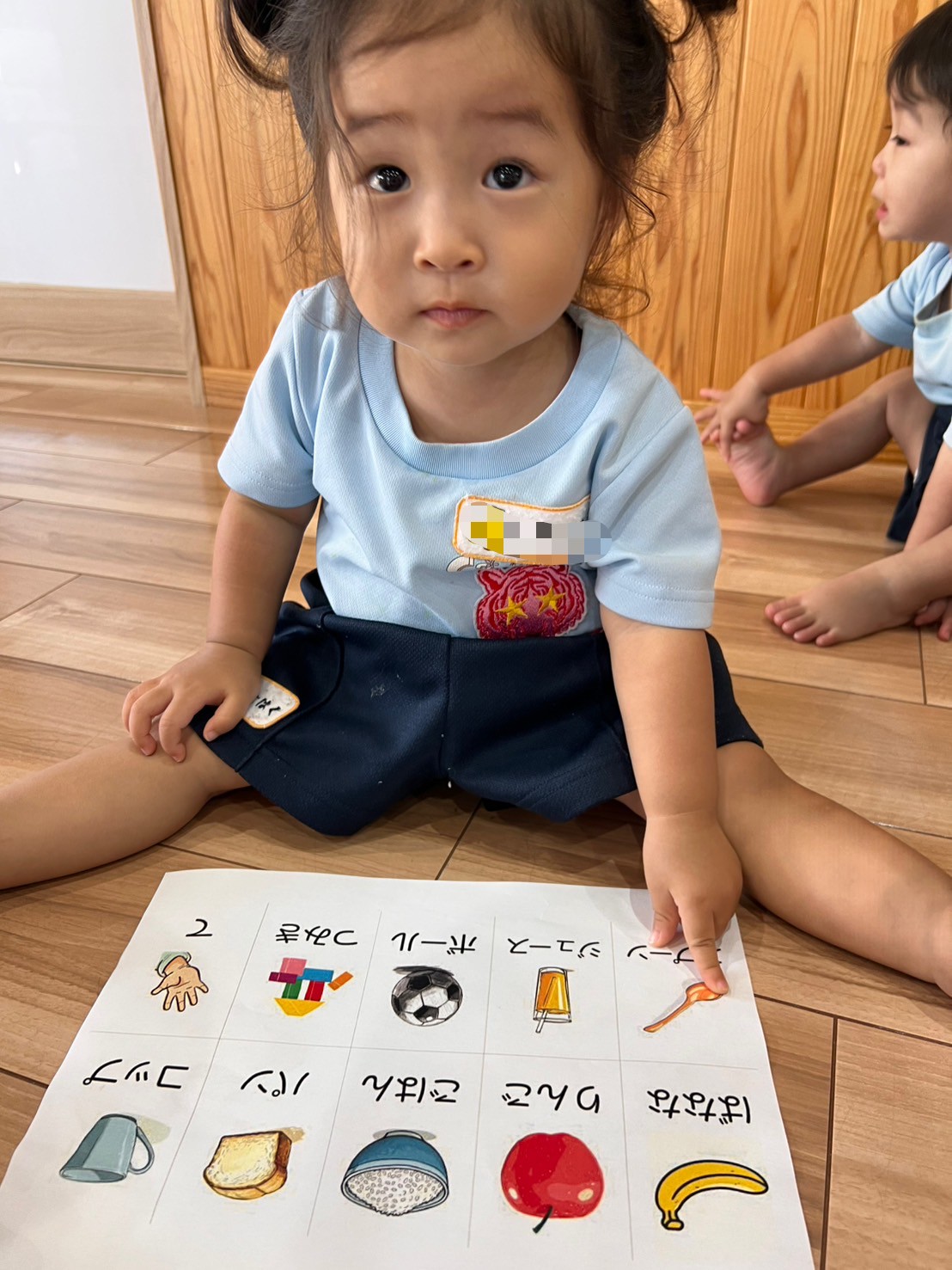今日はさくらんぼリズムをしました!さくらんぼリズムでは音楽に合わせて体をたくさん動かし、とっても楽しそうな子どもたち!その後の絵カードでは、順番を守りながら見つけると指をさしたり、月齢の高い子は「りんご!」「ごはん!」と声に出して答える姿もありました🍎🍚✨ 興味津々で絵と言葉の理解を深める姿が見られましたよ。