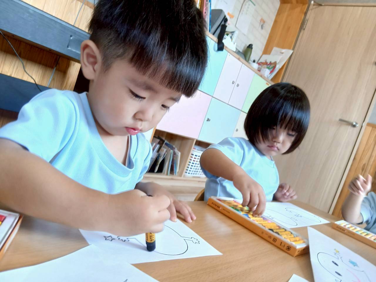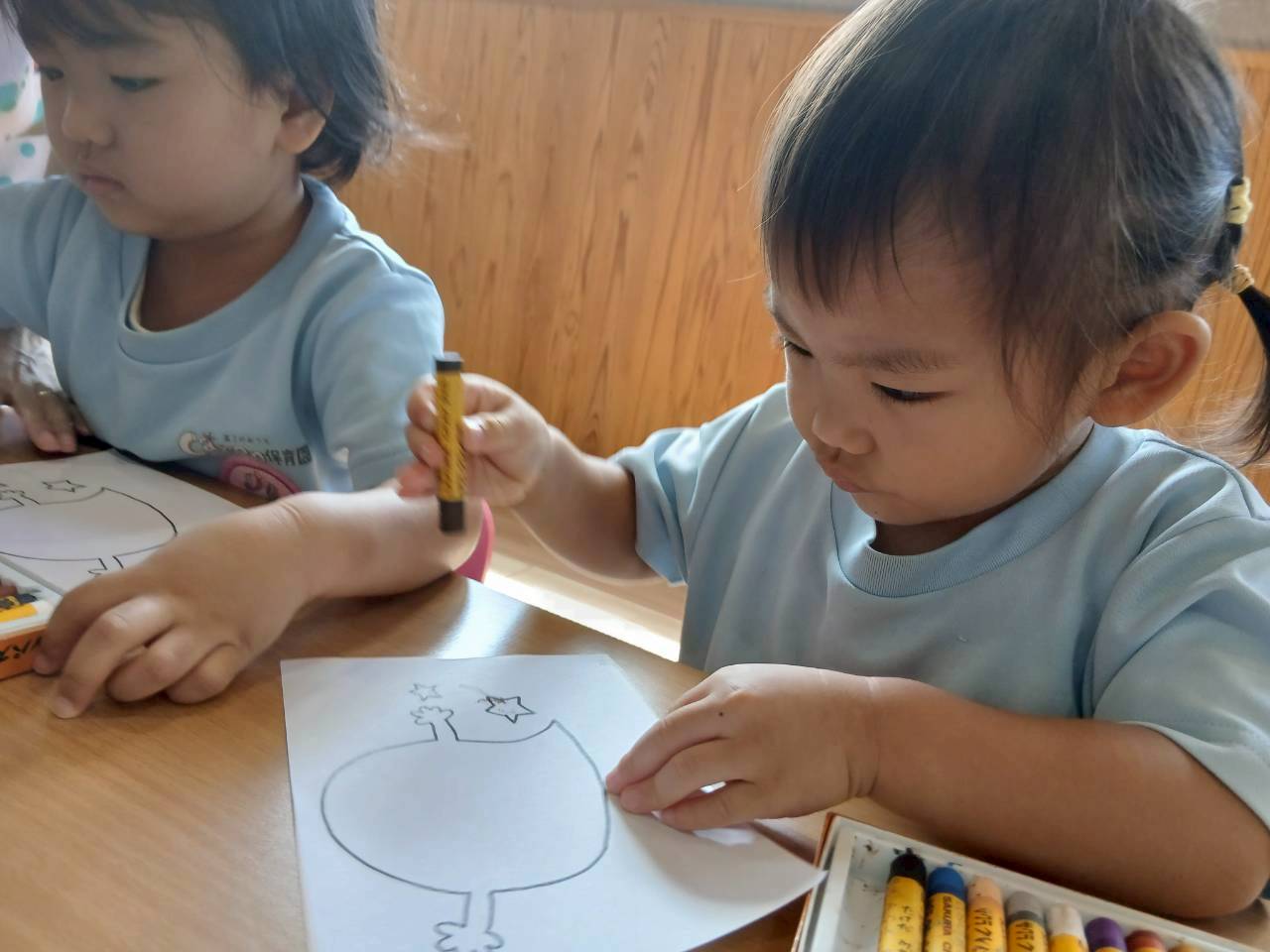 今日は前に描いたおばけ👻のミニお化け👻に目と口をクレヨン🖍️描きました😊。上手にぐるぐると目をかいたりお星さま☆に色をつけたり、最後には帽子にいろんな模様を書いて仕上げました。 出来たお化け👻が飾られるのを楽しみにしているぱんださんです😉。