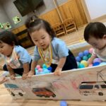 今日はお部屋で長い段ボールバス🚌にボールをたくさん入れてボールプールにして遊びましたよ😄