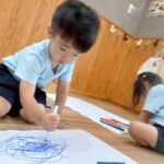 シール貼りの後はお絵描きをしました。この前と同じように一人一人に紙を準備して色々なカラーペンで思い思いに絵を描きました。