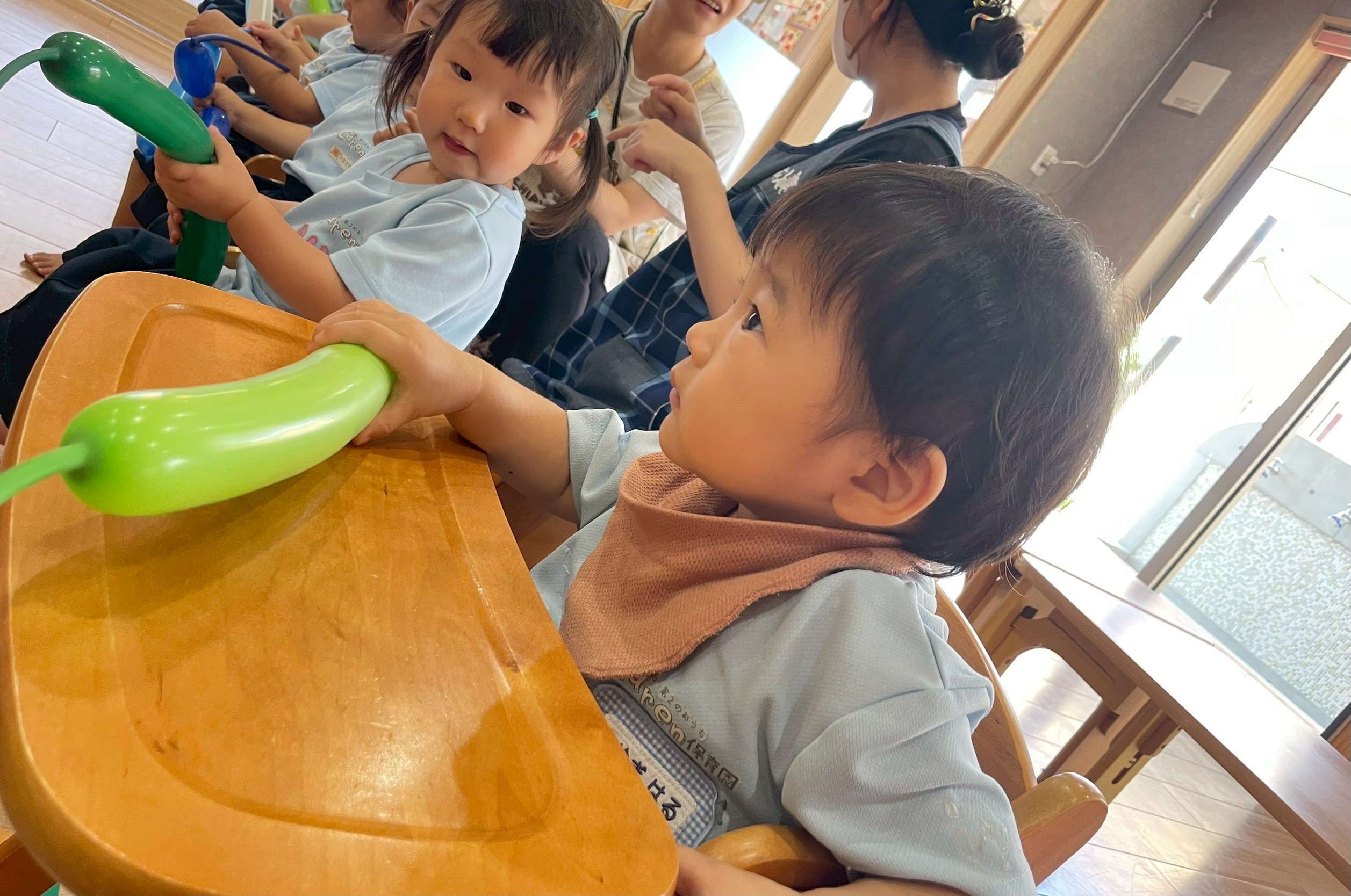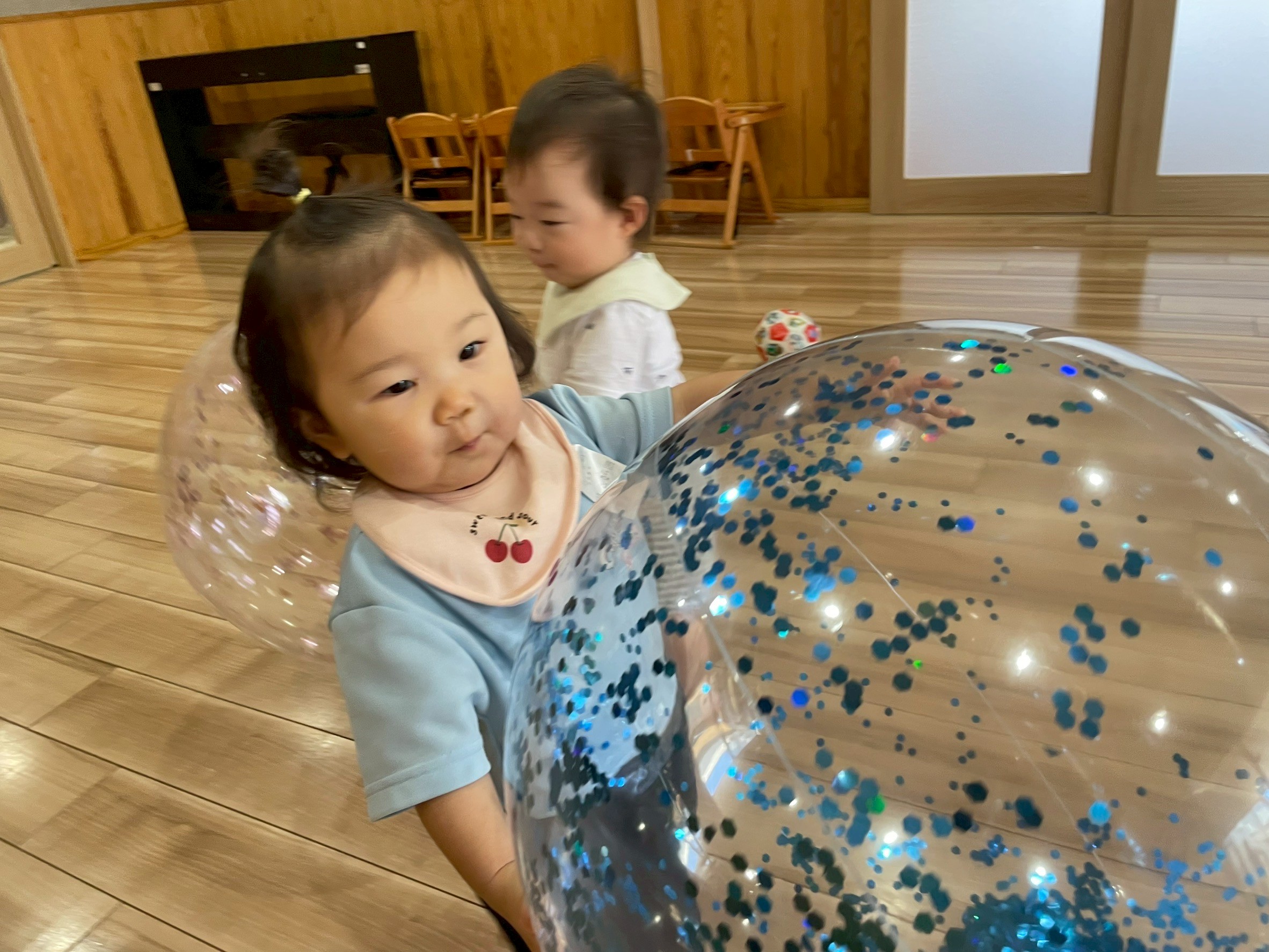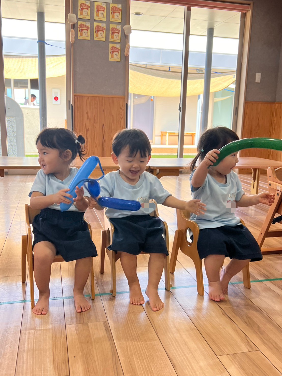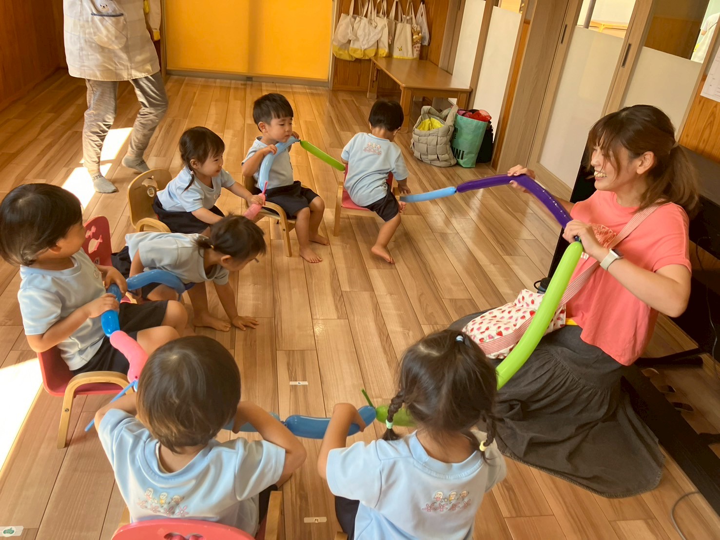 風船を使って「大きな太鼓」の歌を歌ったり、みんなで風船の輪に入り電車ごっこをして楽しみましたよ🚃