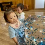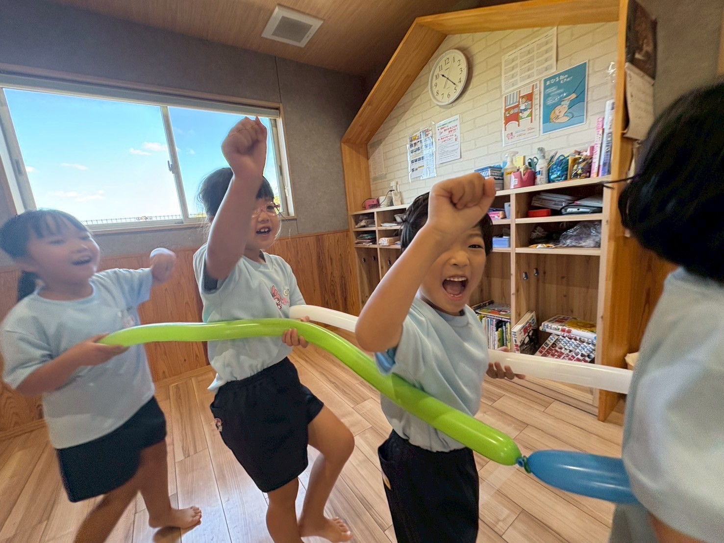 今日は久しぶりのリトミックでした🎶 最初は緊張して涙が出る子もいましたが、少しずつ慣れてくると、先生が膨らませる風船に興味津々👀✨ 握ったり伸ばしたりしながら、「でんでんむしむし〜🐌」と歌に合わせて動かすことを楽しんでいましたよ🎶