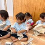 残りは保育者と一緒に折り、可愛いネコのお顔が出来ました🐈⬛✨うさぎ、こあら、きりん