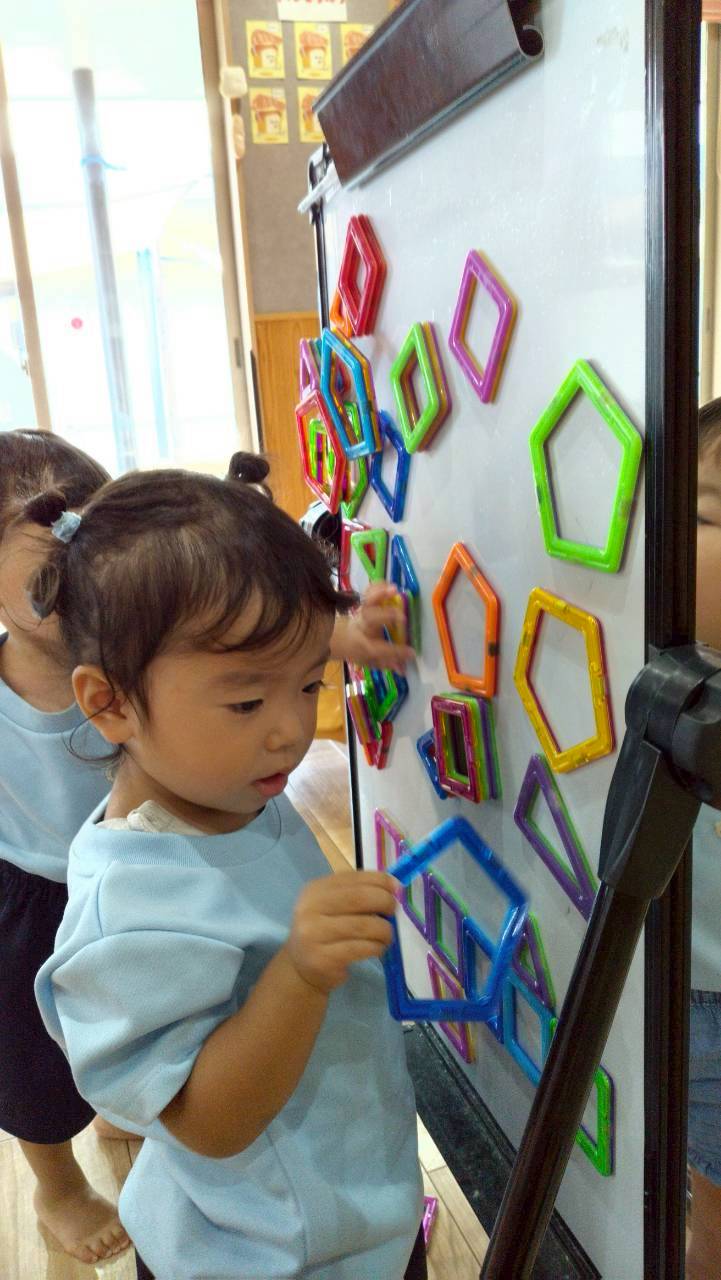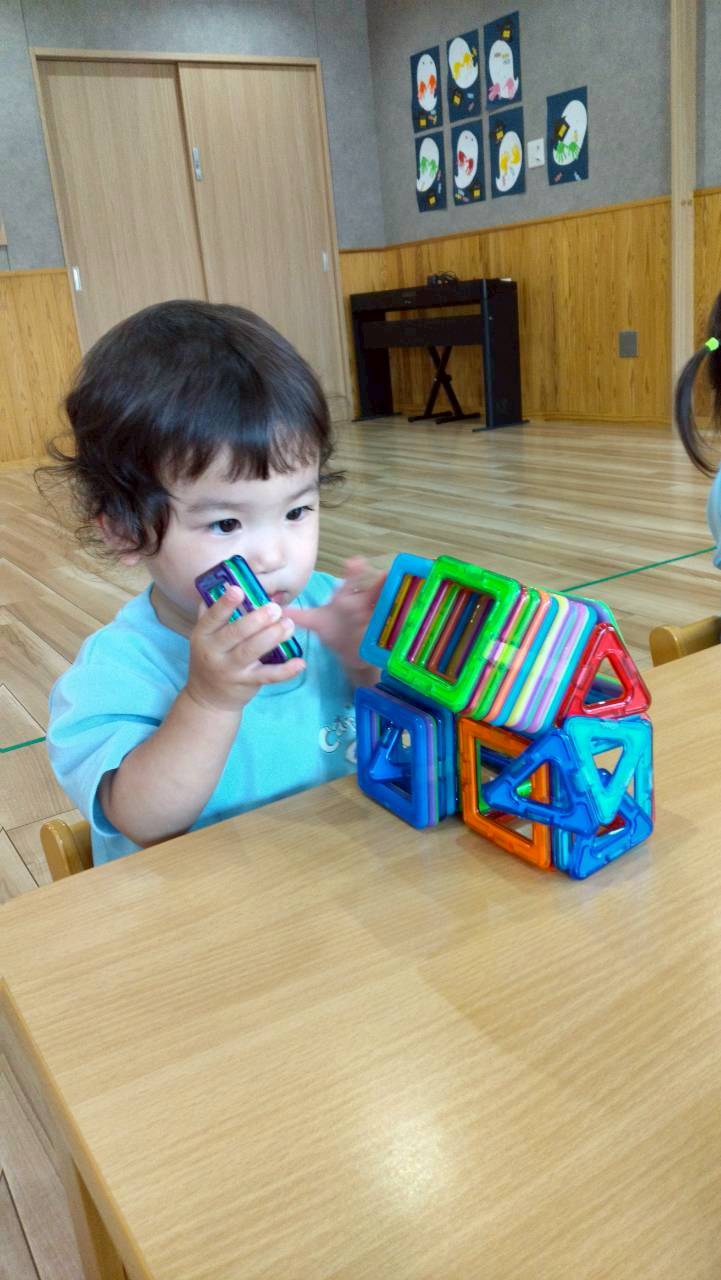 今日はお部屋でマグフォーマー遊びからスタートしました☺️カラフルなマグフォーマーを重ねたりくっつけて楽しそうでした✨先生と一緒にアイス🍦を作って食べっこしたりお家🏠️や帽子ができると興味津々でしたよ💕それからホワイトボードにマグフォーマーを思い思いにたくさ〜んくっつけて磁石🧲の面白さを感じて夢中で遊びました😆その後はひよこ組さんやぱんだ組さんとてくてくロードへ「レッツゴー!」とお散歩に行きました🌞お花や落ち葉、涼しい風など小さな秋を見つけながら歩きましたよ😄手すりを持って階段登りも頑張りました👏たくさん歩いたので給食もパクパク!!お昼寝もぐっすりのりす組さんでした😆💕ぱんだ組🐼
