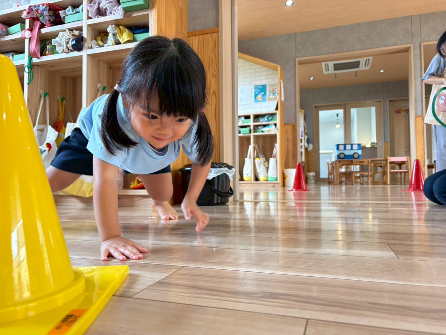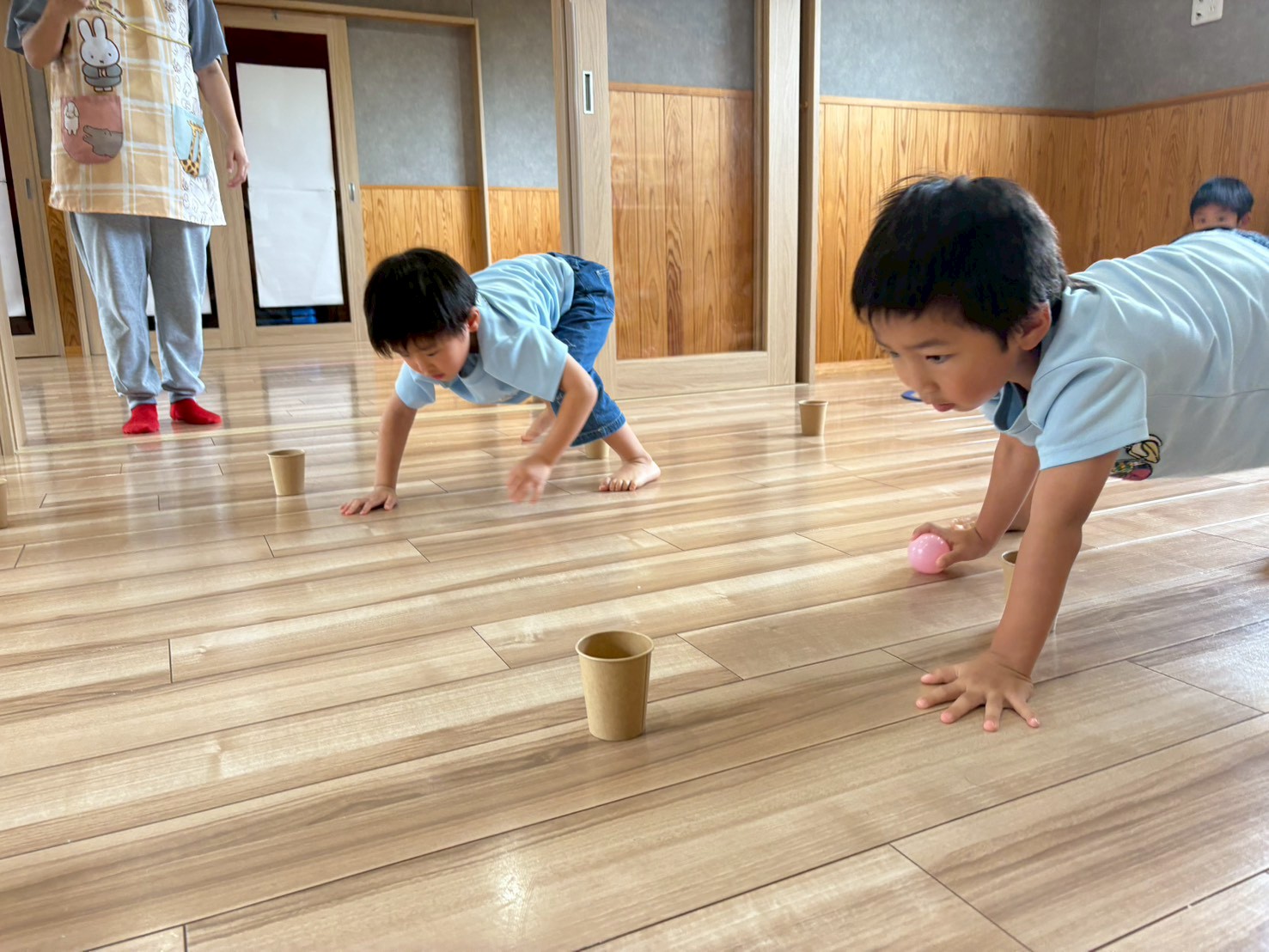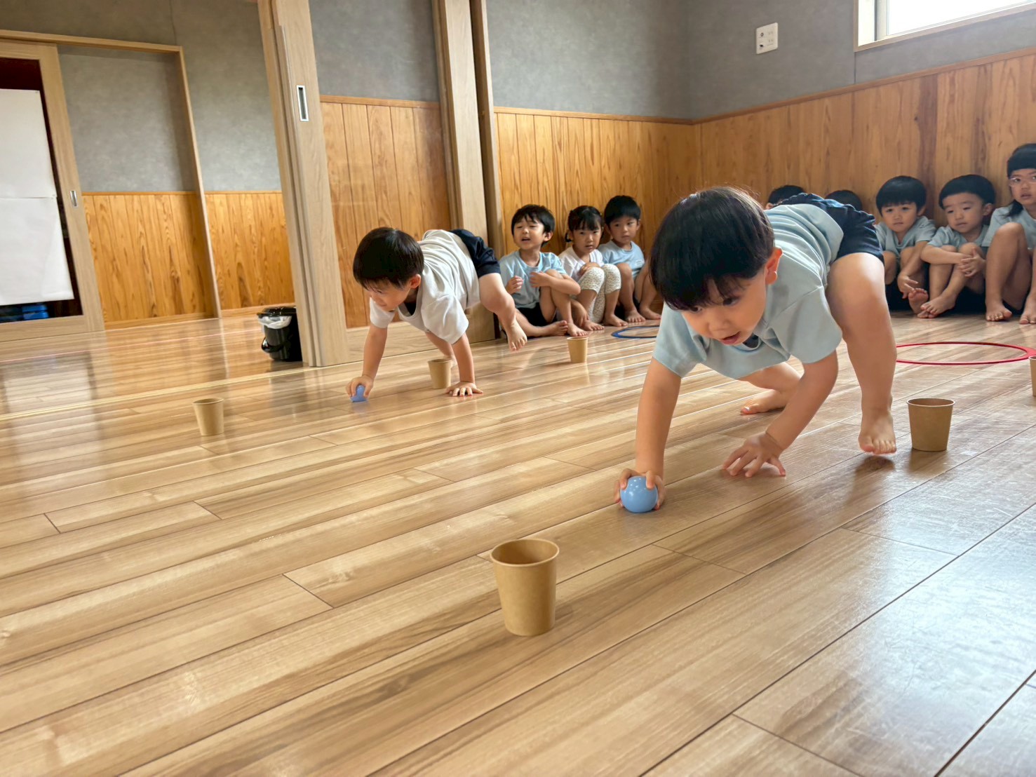 四足歩行で、ボールを一列に並べた紙コップに1つずつに入れていきました🟣🔵