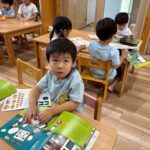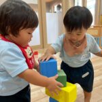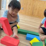 ブロック遊びでは、保育者と一緒に積み上げて楽しんでいると、他のお友達も来て、みんなで協力して積み上げる事ができました🥰