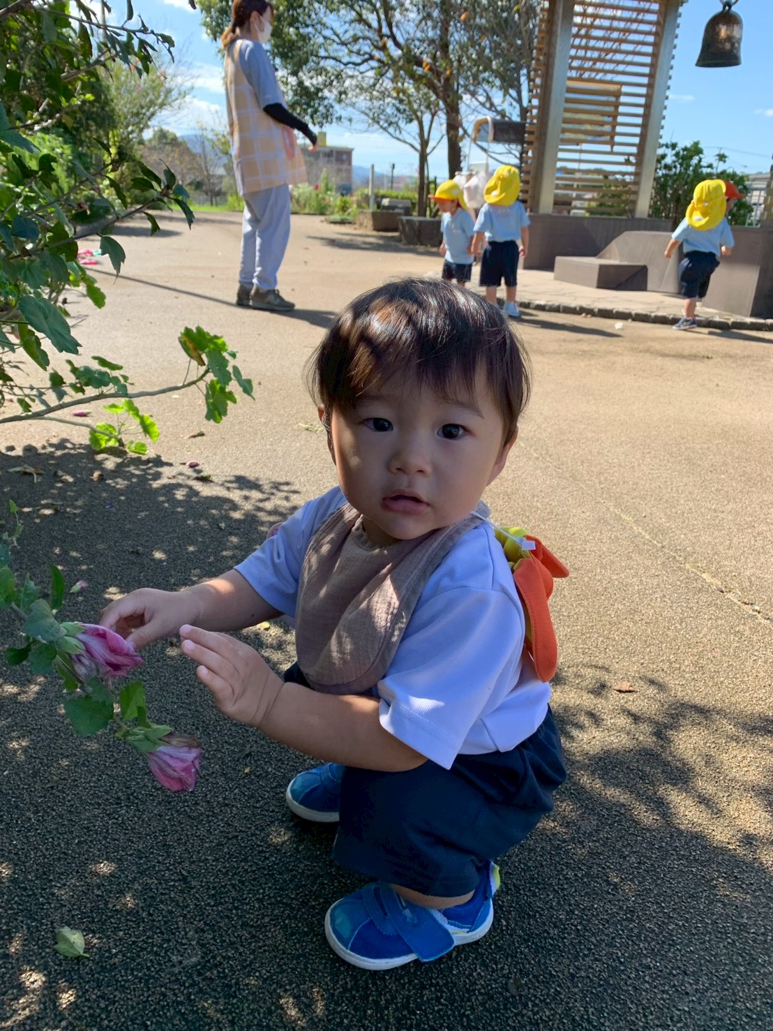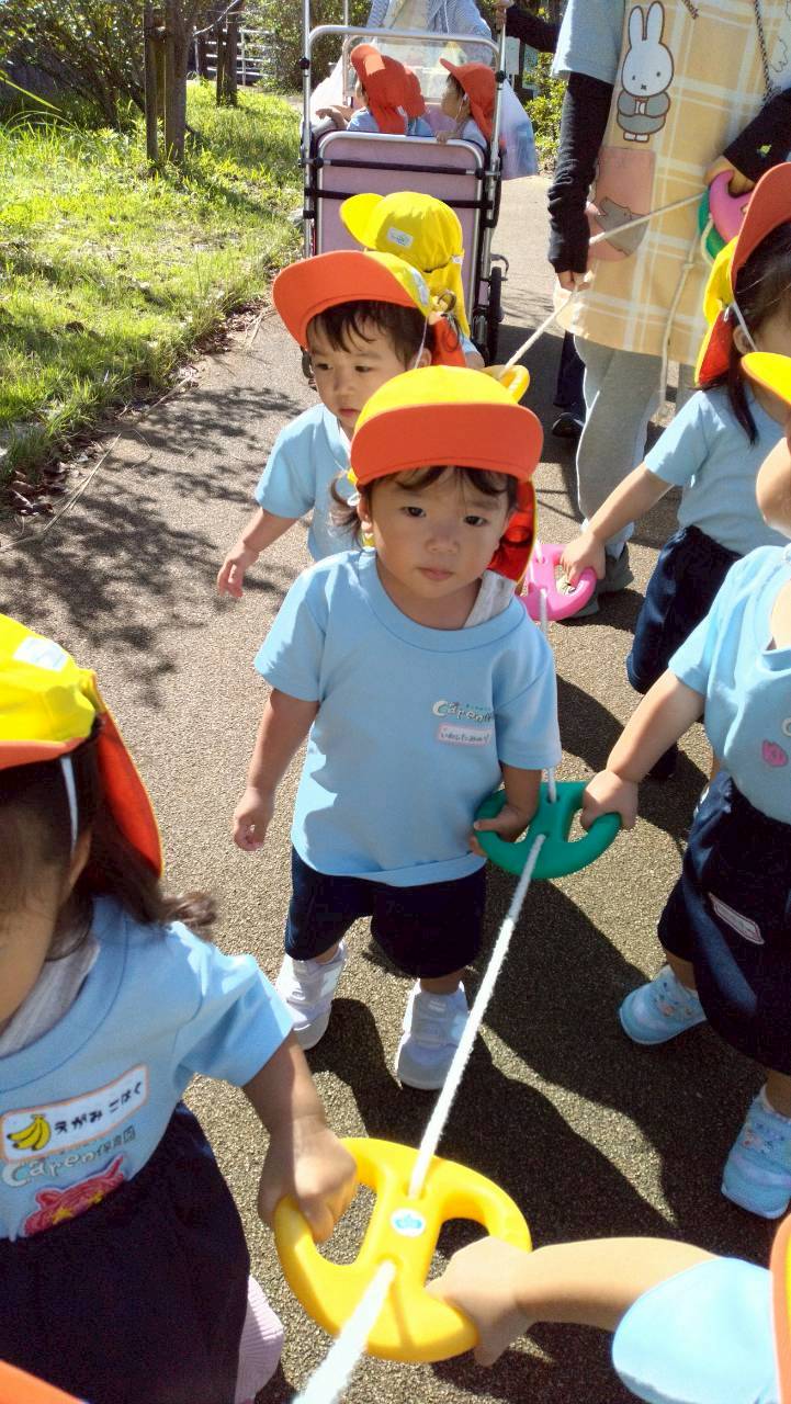 今日はひよこ組さんと一緒にてくてくロードまでお散歩しました🌞誘導ロープを握って「レッツゴー!」と笑顔で出発して😄川のお魚や蝶々、どんぐり、落ち葉🍂などいろいろな小さな秋も見つけましたよ👀保育園の側を歩く時にはぱんだ組さんから「いってらっしゃい〜」と応援もしてもらい嬉しそうでした💕それからみんなでかけっこしたり色とりどりの秋のお花を興味津々で見たりして思い思いに探索してのびのび元気に過ごしました😆