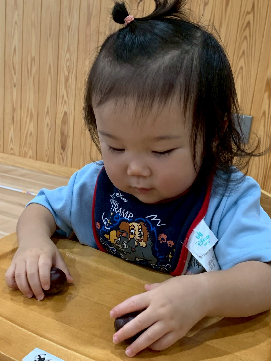 今日はハロウィン散歩のバックのシール貼りをしました🎃自分でシールを剥がそうと頑張っていましたよ😊ペタペタと貼って可愛いバックができていました❣️その後は栗の実に触って遊びました🌰コロンとしてちょっと先が尖っていて固くて…と不思議そうに手に取っていましたよ😊その栗をブロックと一緒に袋に入れたり出したりして楽しみました😀それから今日はリトミックの日🎵歌に合わせて鈴を鳴らしたり、カップに入れて振って音を聞いてみたり、フープを持ってバスごっこをしたりと、楽しい時間でした💕