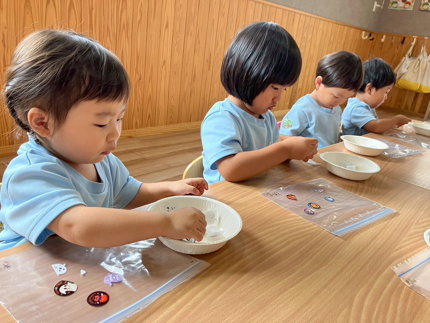 今日はハロウィン散歩に使うバックにシール貼りをしました😊ハロウィンにちなんだカボチャやオバケのシールを貼り、楽しかったようで「シールのおかわり!!」と言ってシールを追加でもらっていましたよ🥹❣️次に体操服を脱いで裏返して準備し、元に戻して体操服を着る競争をしました👕 保育者に教えてもらいながら自分の力でやってみようとする姿がかっこよかったですよ🩷リトミックではカップスとベルを使い、音を奏でて遊んだ子ども達でした🥰🎵