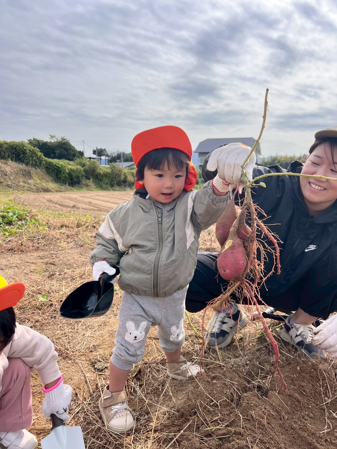 朝から「おいもの歌」を歌い大好きなバスを目の前にワクワクしていた子どもたちでした🥰 バスに乗って畑に向かうと、軍手とスコップを受け取り、先生と一緒に楽しくお芋を掘りました💕