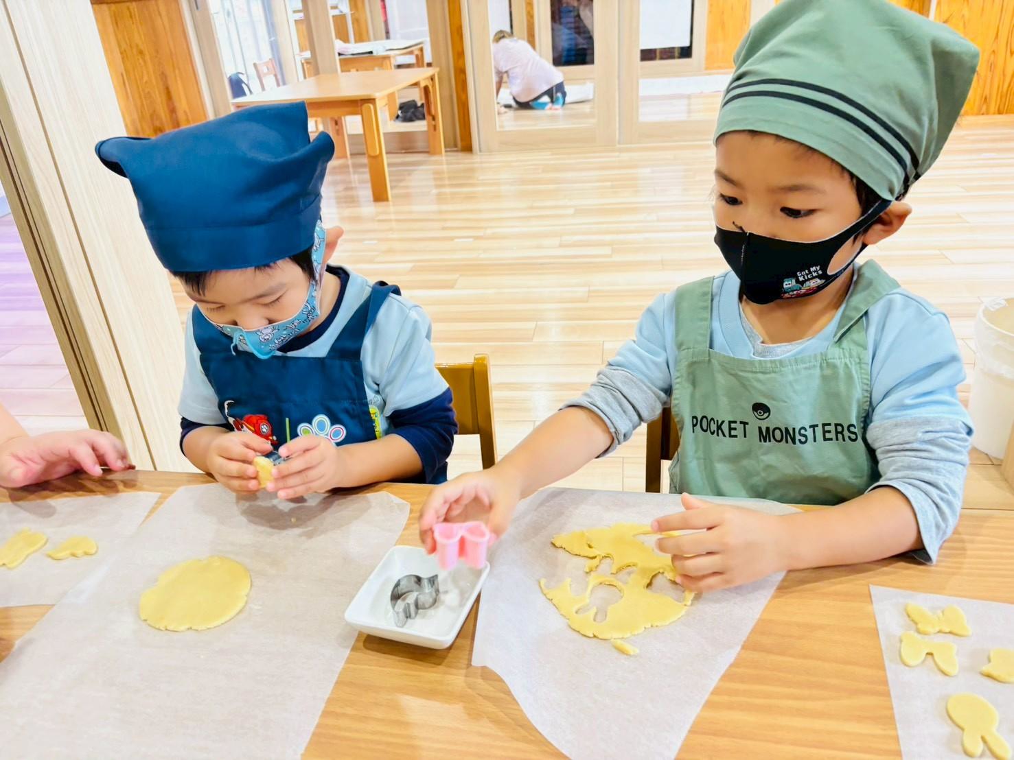 くま🧸、星⭐、王冠👑、車🚗など、いろんな型の中から自分の好きな型を選んで、先生に手伝ってもらいながら上手に形をくり抜くことが出来ましたよ😍焼けるのを心待ちにしているぱんだ組さんです😆🎶
