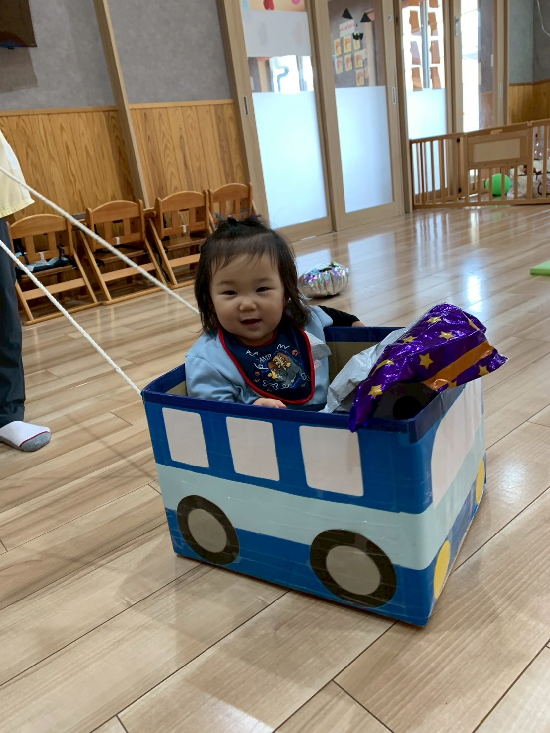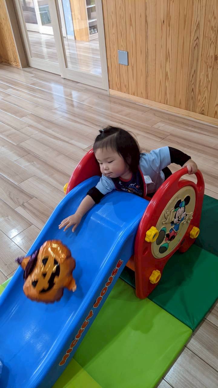 今日は絵の具を手につけて画用紙にペタペタとフィンガーペイントをしましたよ😊絵の具の感触に手を引っ込めていましたが、慣れてくると楽しそうに絵の具をつけ、可愛いハリネズミが出来上がりました🦔その後は、お部屋で滑り台や段ボールバスに乗って遊びました❣️段ボールバスにオバケ👻の風船を入れて一緒にお散歩していましたよ🥰