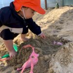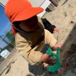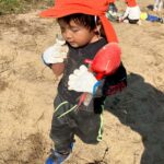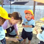 「うんとこしょ〜どっこいしょ〜」と歌いながら、練習はバッチリ👌いざ!芋掘りへ!と砂場に入り、大小のスコップを自分で選び、砂を掘ったり、お芋がくっついているヒモを引っ張ったりして頑張りましたよ💓