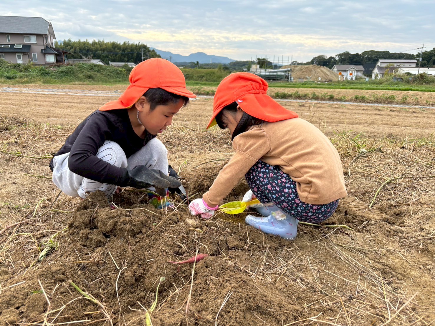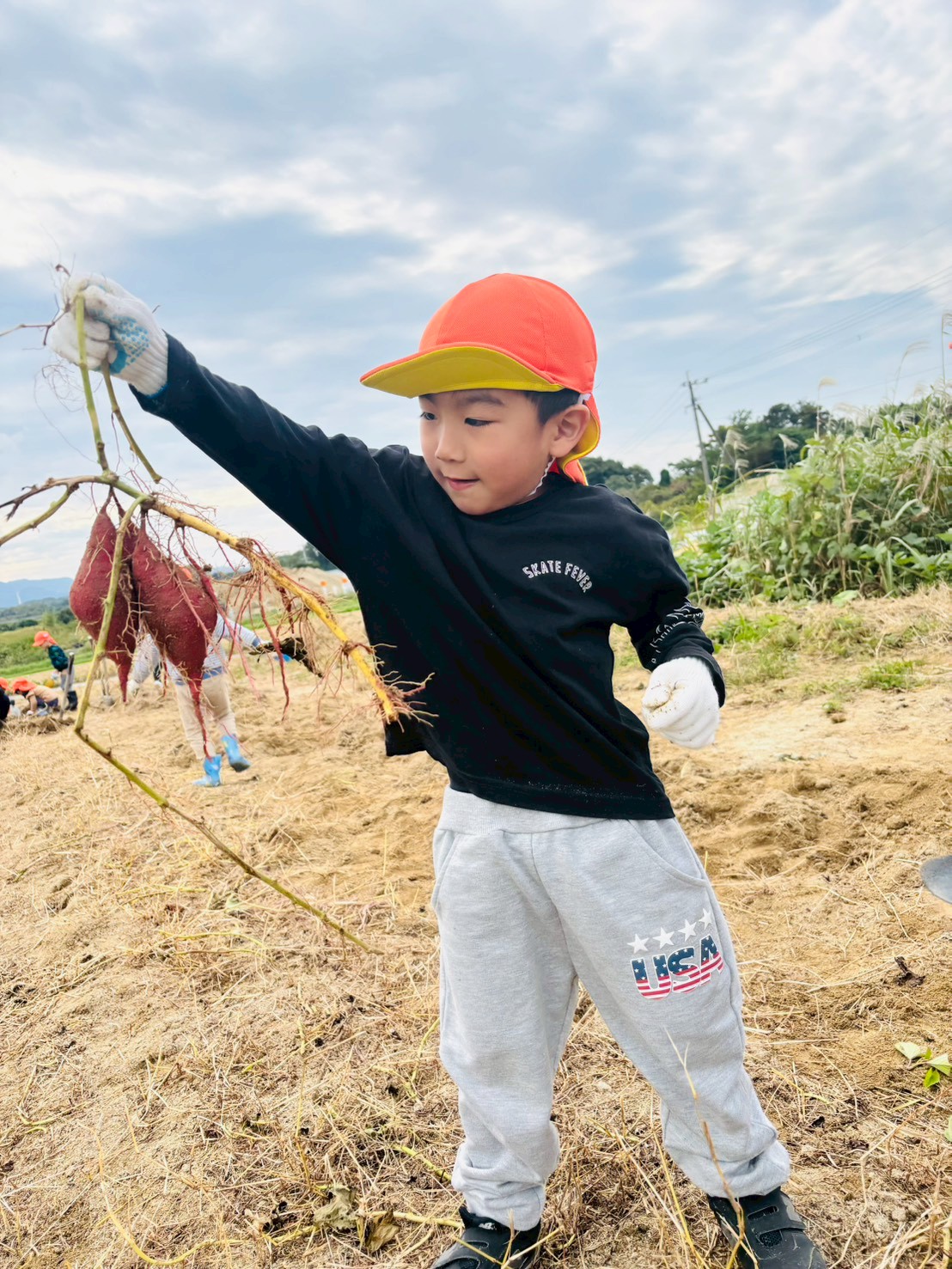 「うんとこしょ〜どっこいしょ〜」と歌いながら、練習はバッチリ👌いざ!芋掘りへ!と砂場に入り、大小のスコップを自分で選び、砂を掘ったり、お芋がくっついているヒモを引っ張ったりして頑張りましたよ💓