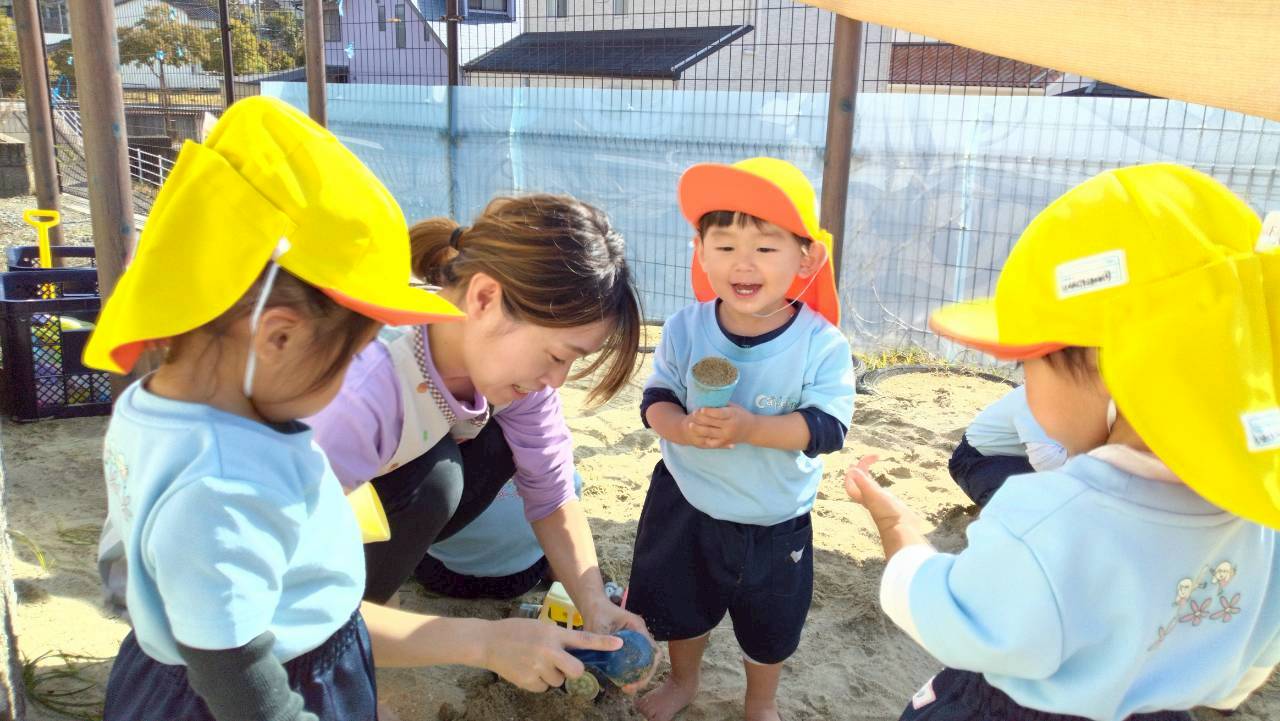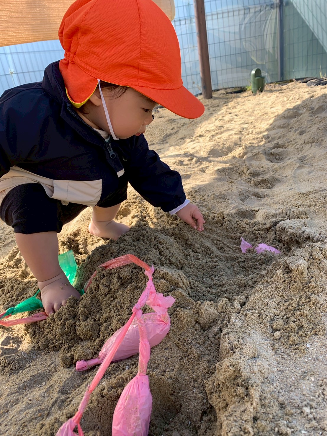 今日は秋晴れの爽やかな天気☀️園庭のお砂場にさつまいもを埋めて、ひよこさん🐥達もお芋掘りをしました🍠