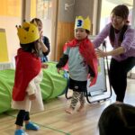 先生たちの出し物は「変身トンネル」🎶 小さい頃の先生たちの写真を見て興味津々の子どもたちでした☺️最後はお誕生日のお友だちがトンネルをくぐって「へんしん!へんしん!」冠とマントをつけて登場しましたよ✨️