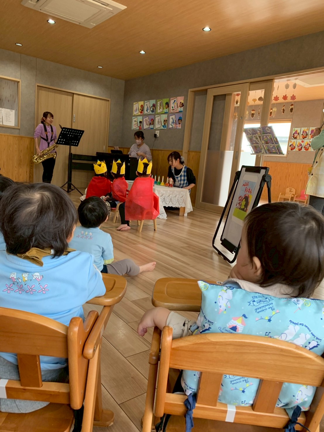 サックスやフルートなどの楽器の演奏もあり、音楽に合わせて歌う子どもたち💖夢中で演奏を聞く姿もありました🥰
