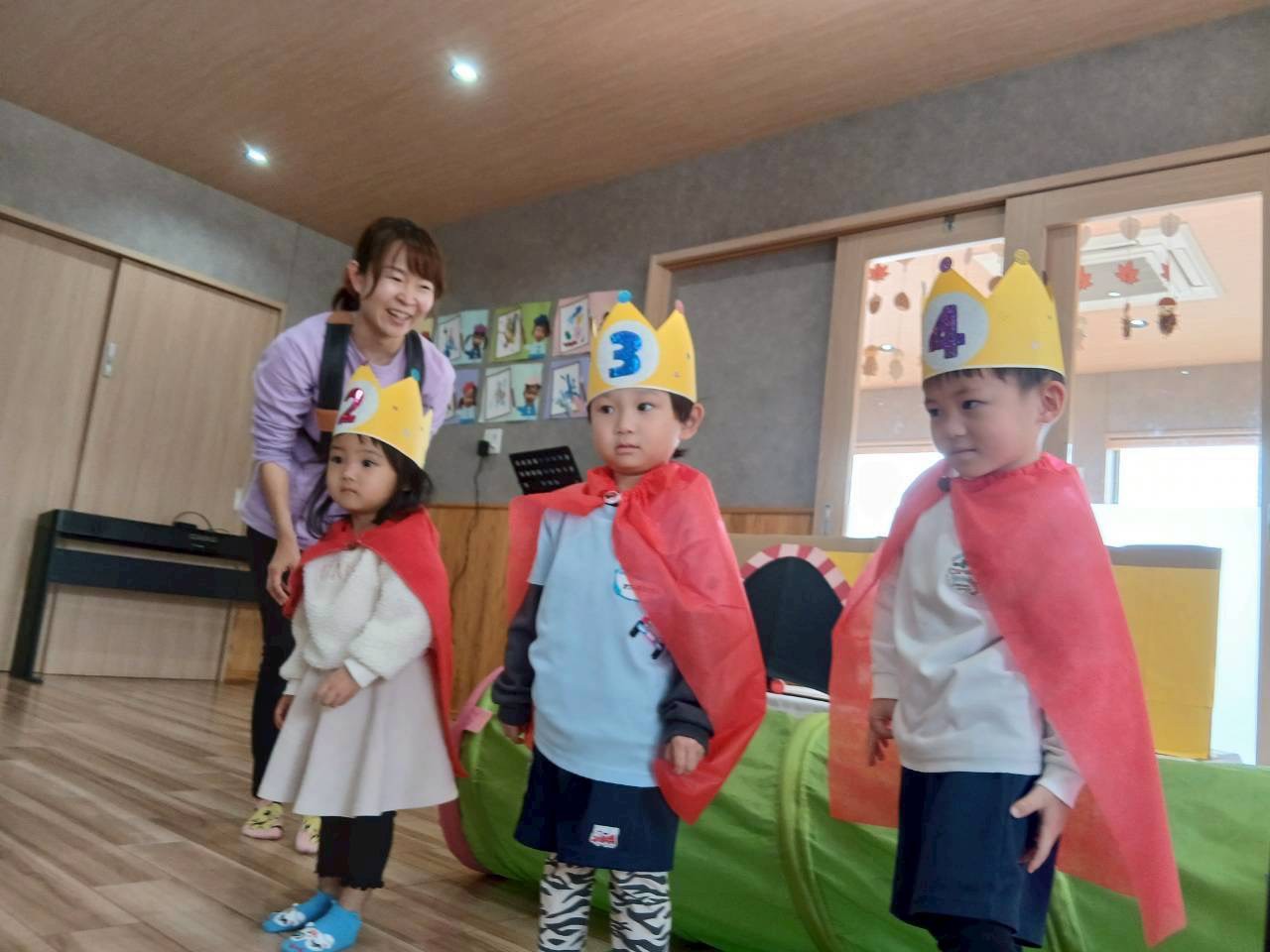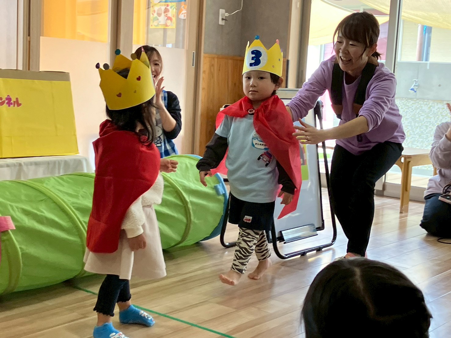 先生たちの出し物は「変身トンネル」🎶 小さい頃の先生たちの写真を見て興味津々の子どもたちでした☺️最後はお誕生日のお友だちがトンネルをくぐって「へんしん!へんしん!」冠とマントをつけて登場しましたよ✨️