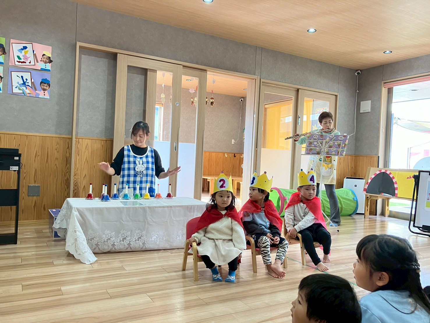 オタマジャクシは何になるでしょう?の質問にぱんだ組さんが選ばれ、「カエル🐸!」と見事に大正解🩷最後はお誕生者が王様に変身し、サックス🎷フルート🪈ハンドベル🔔ピアノ🎹による豪華な演奏会もありました🥹🩷