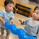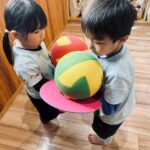 丸い風船や細長い風船を先生が膨らませるのをワクワクしながら見ていました😊風船を追いかけたり高く投げたりして今日も元気いっぱい遊びました💕
