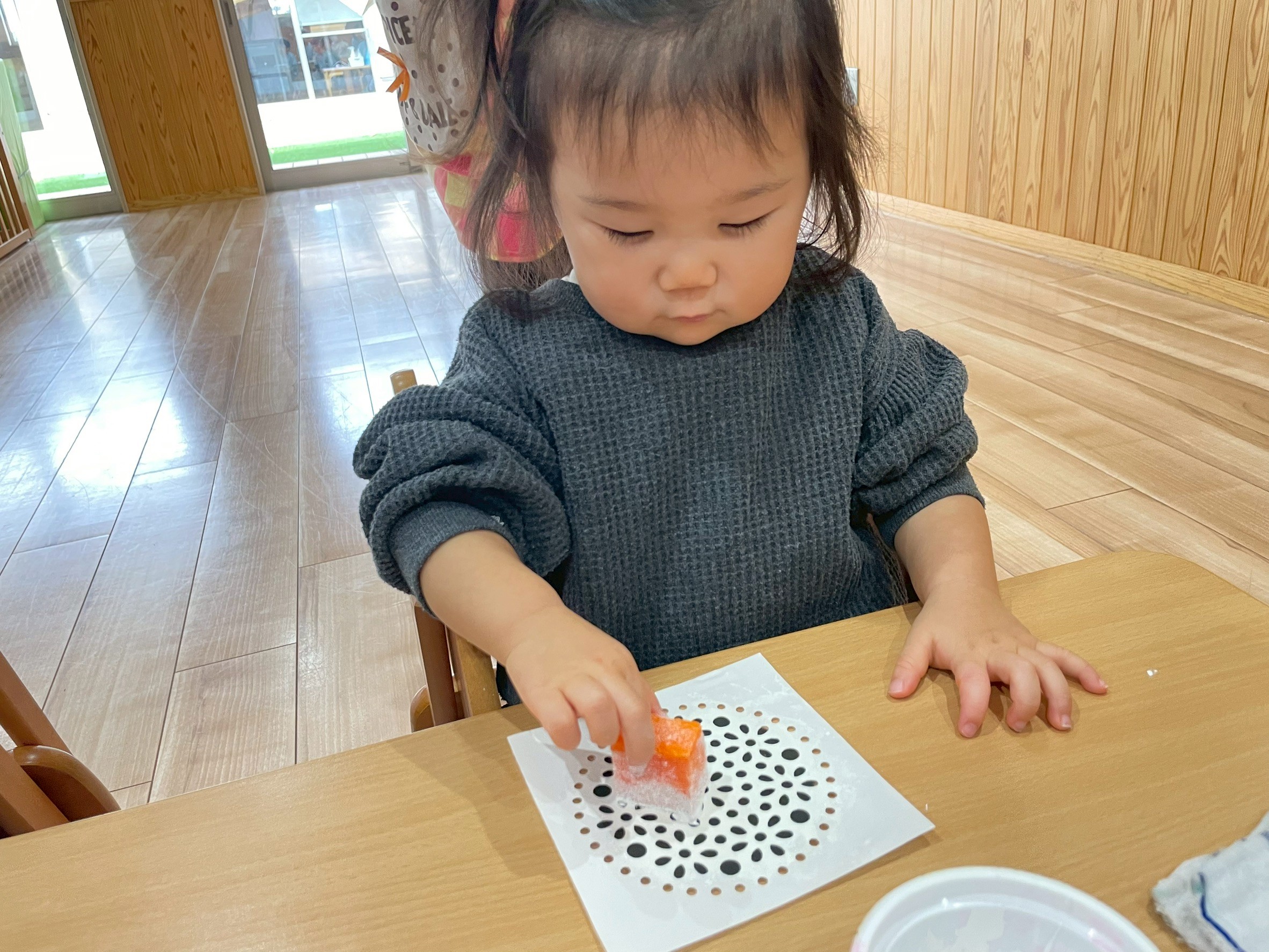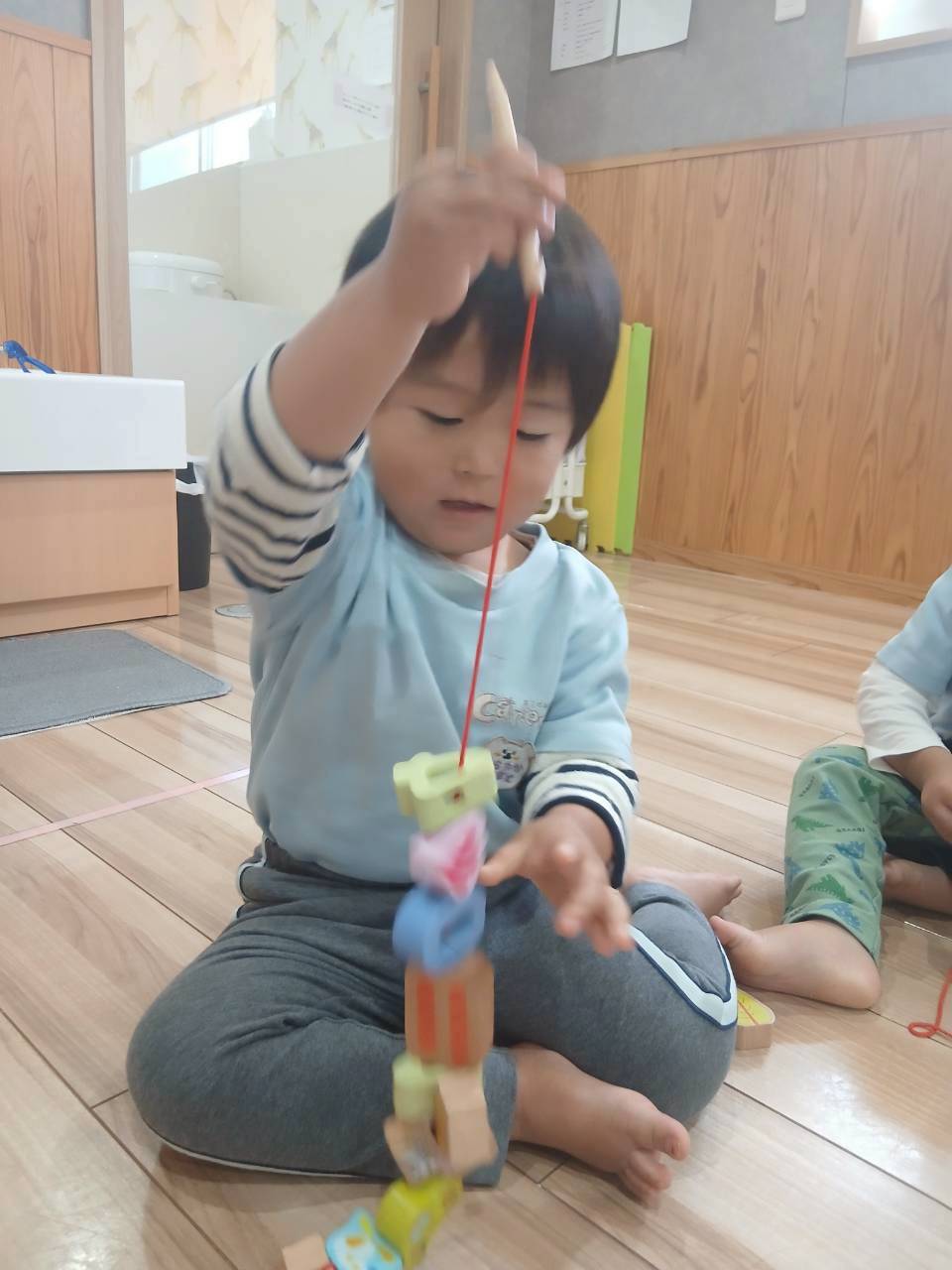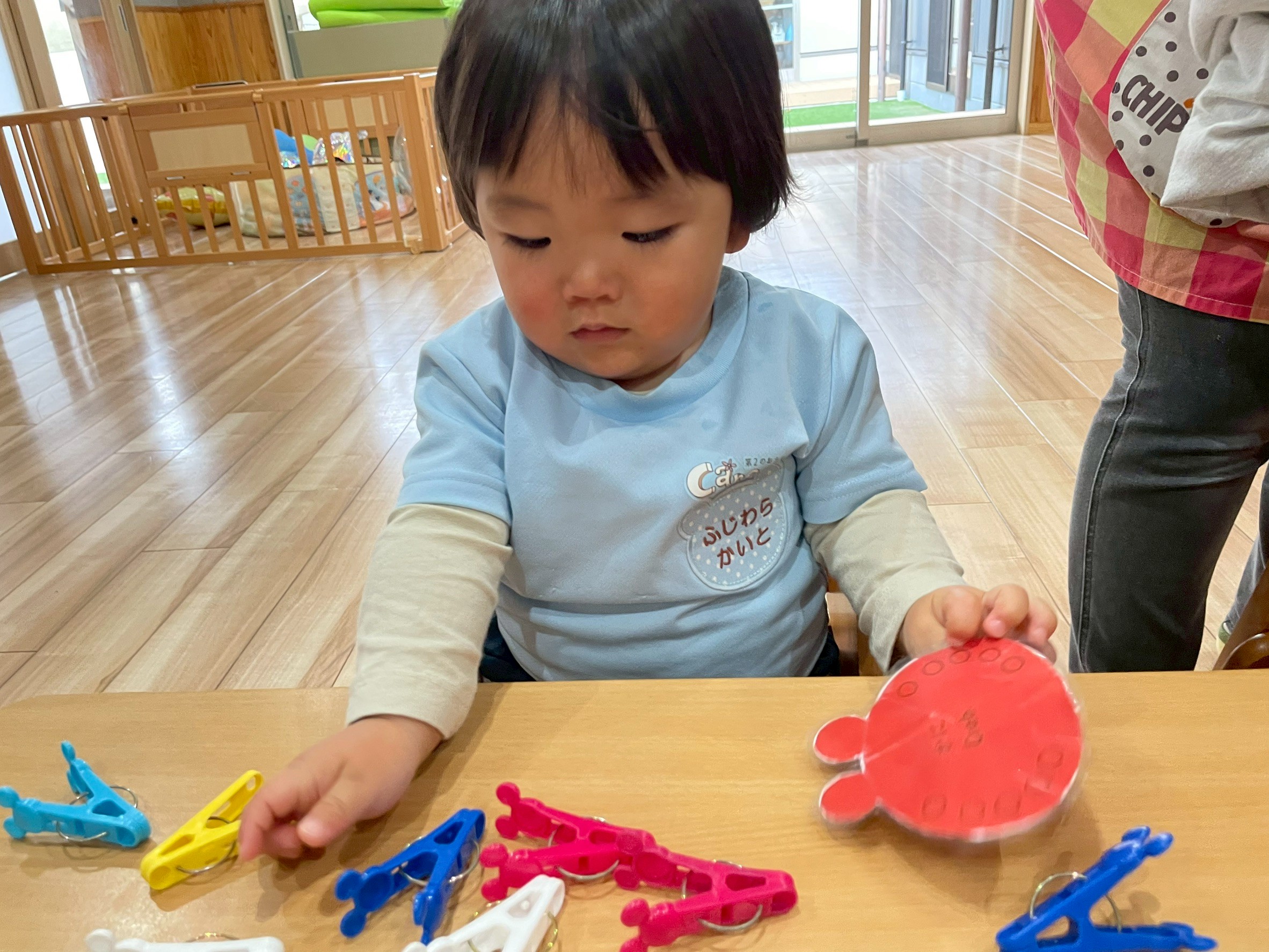 お友達がやる様子を見て、やってみたいという気持ちが芽生えたり、取ってほしい物を先生に伝える事ができました😊