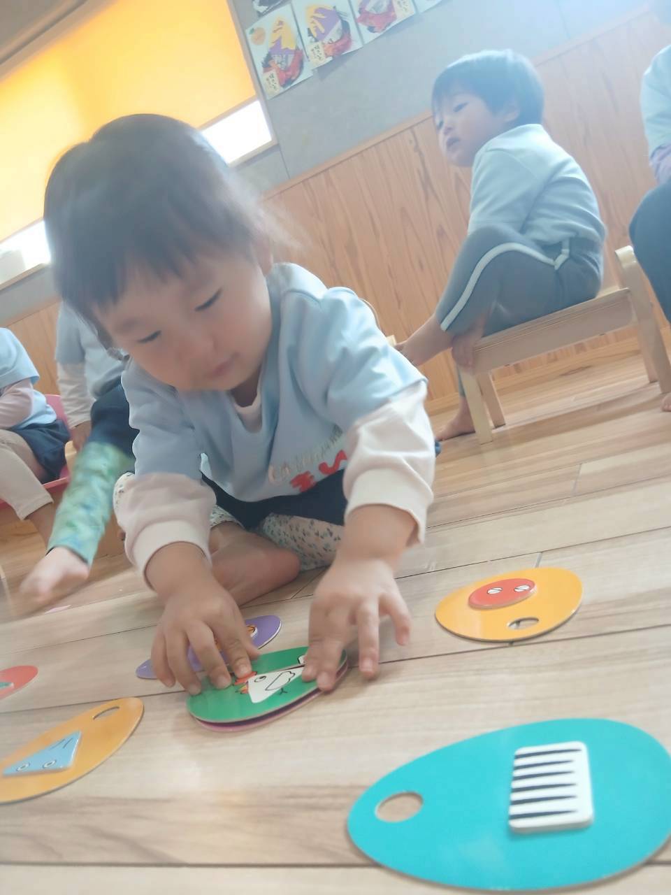 最後は動物の型はめゲームをしました。好きな絵を選び空いてる型と同じ型を見つけれてはめて🦁🐱🐰動物の名前も英語で上手に発音する事できていました🐔