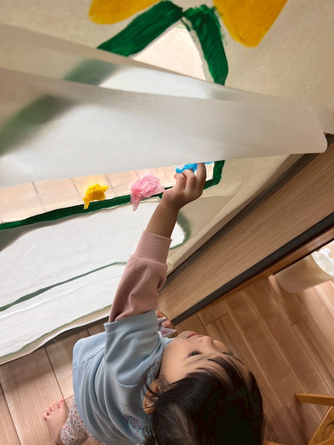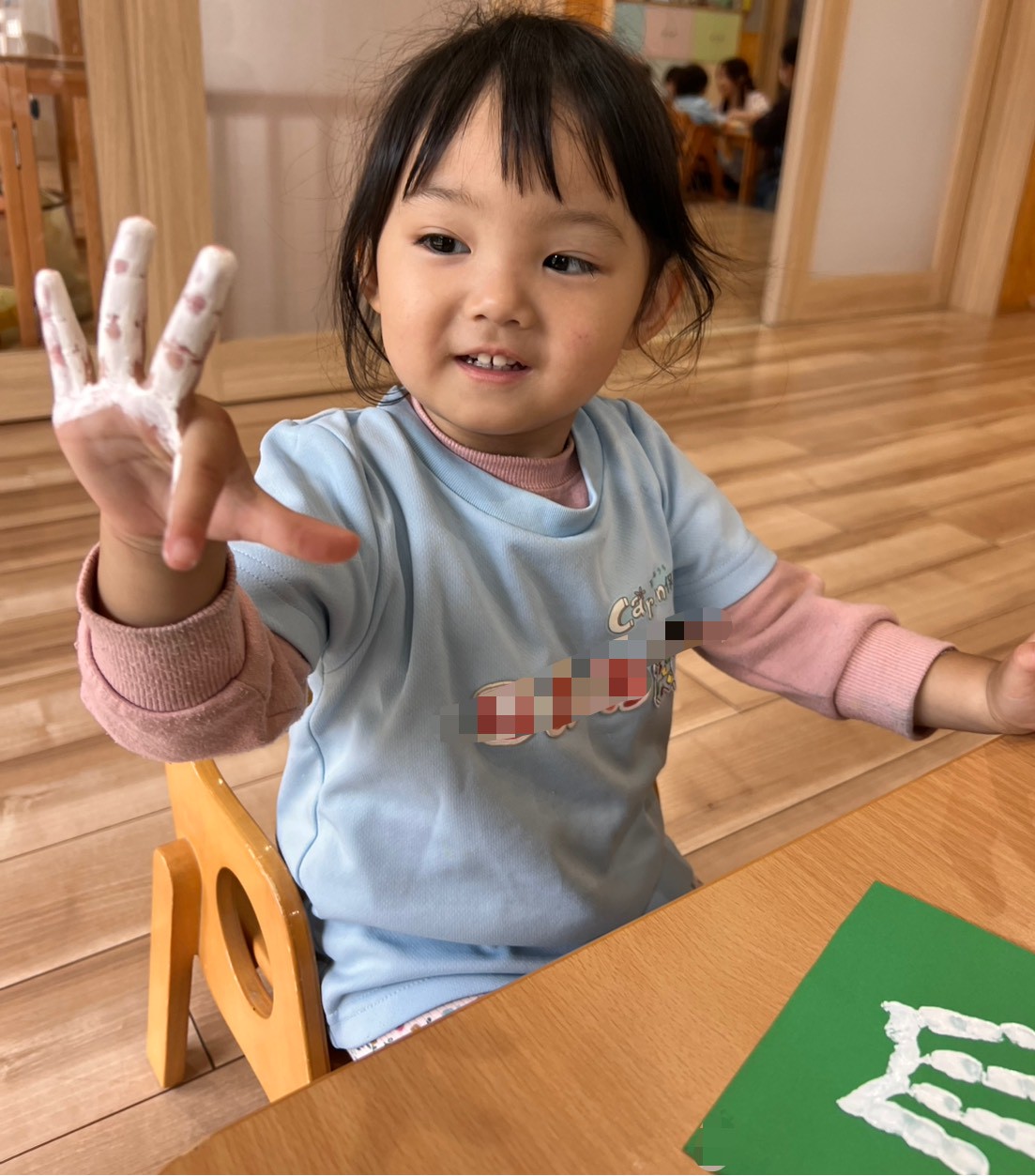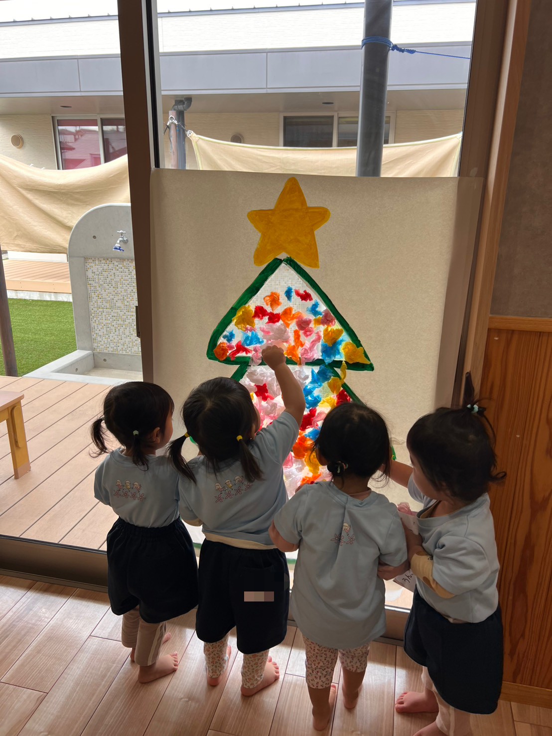 指に絵の具をつけて雪だるまを作ったり、花紙を丸めてツリーに貼ったりと、夢中になって取り組む子どもたち!