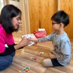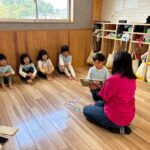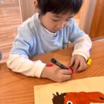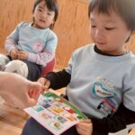 クリスマスにちなんだ英語を教えてもらい、知っている単語が出てくると元気に答える姿や、講師の絵本を集中して見る姿が見られました。そのあとは、カレンダー製作の仕上げで梅の花を貼りました🌸