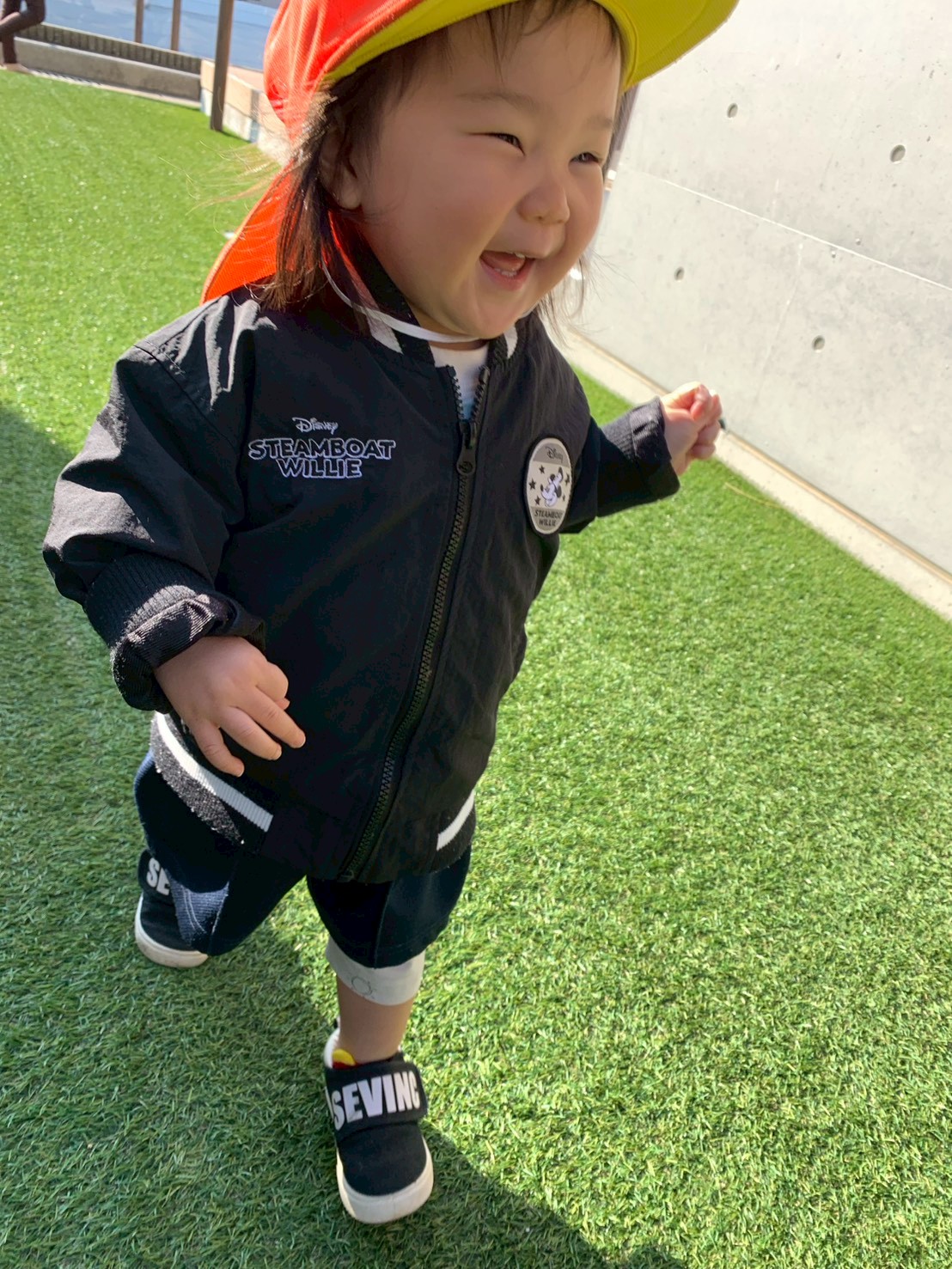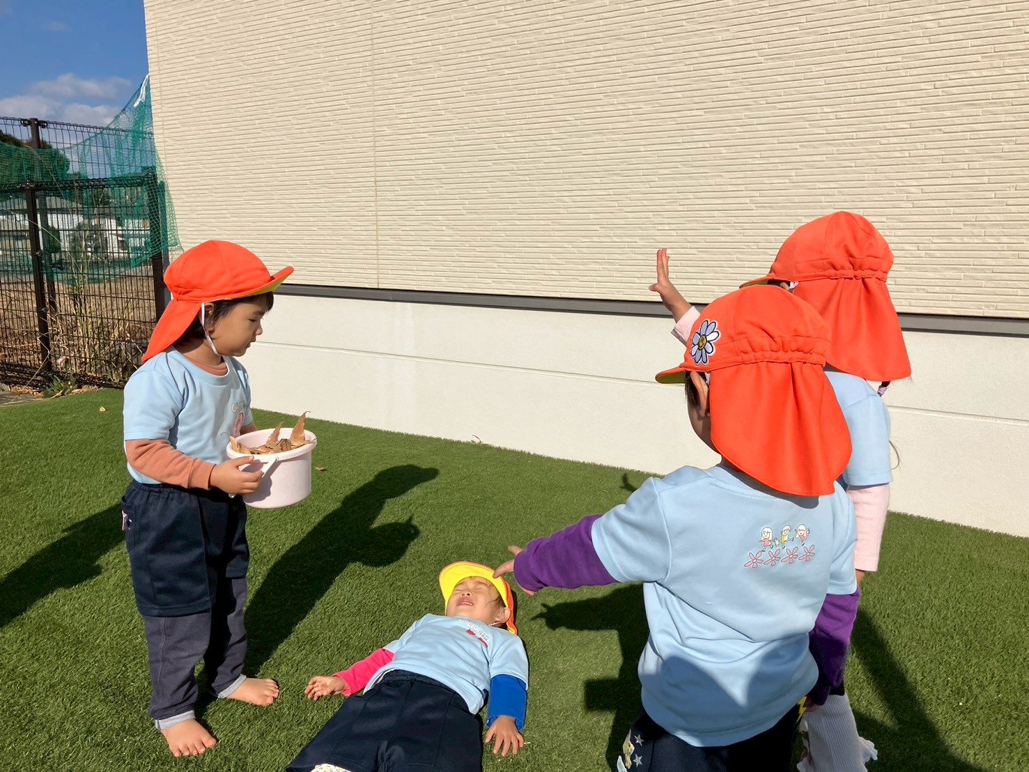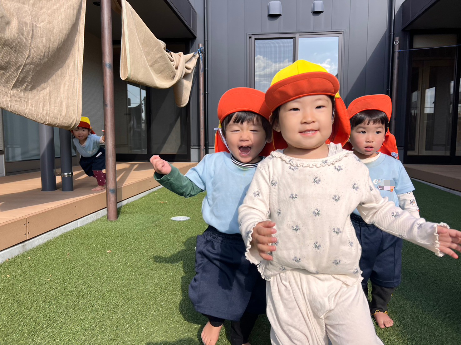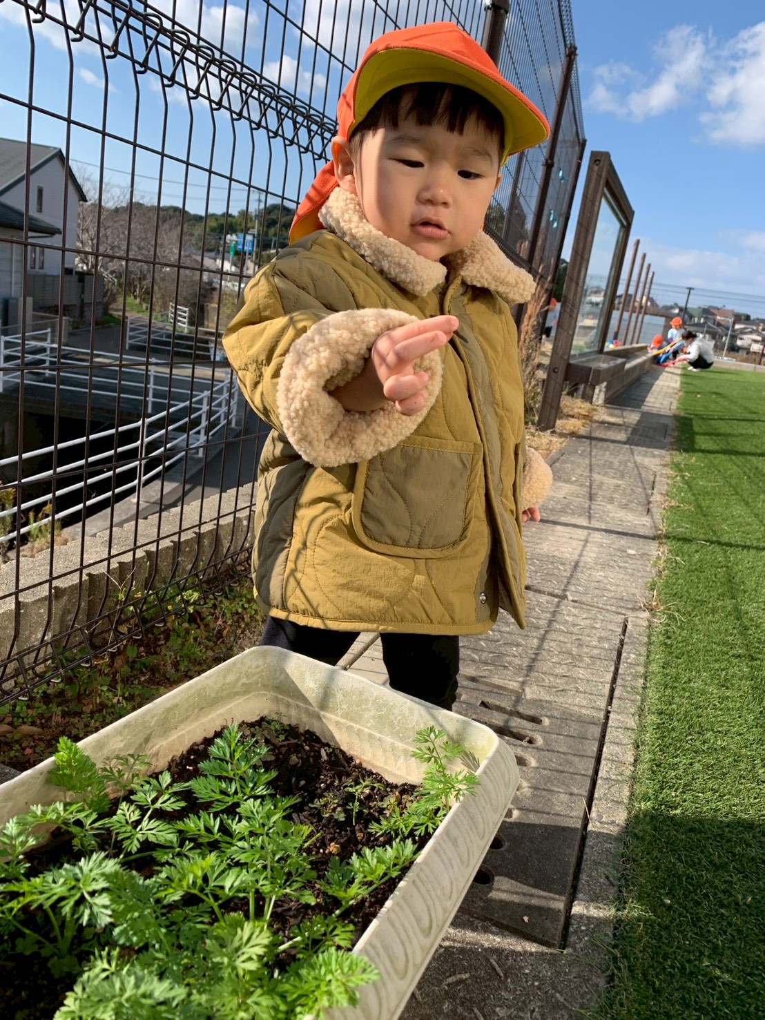 その後は園庭に出て、落ち葉を拾ったり、フェンス越しに犬の散歩をしている人に手を振って挨拶をしたり、プランターのお野菜を「にんにんしゃん🥕」と言って葉っぱに優しく触ったりして楽しみました😃