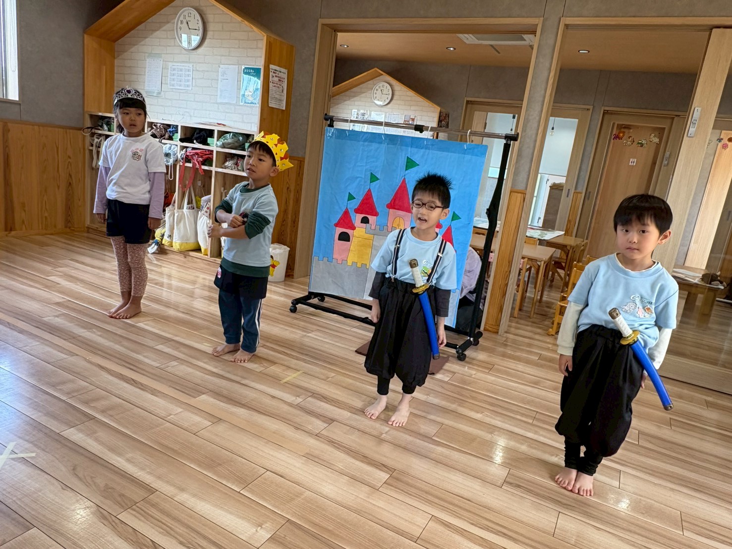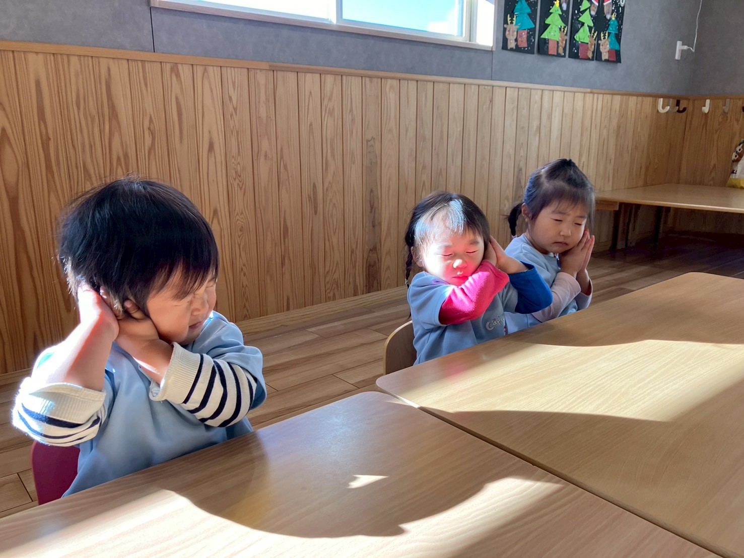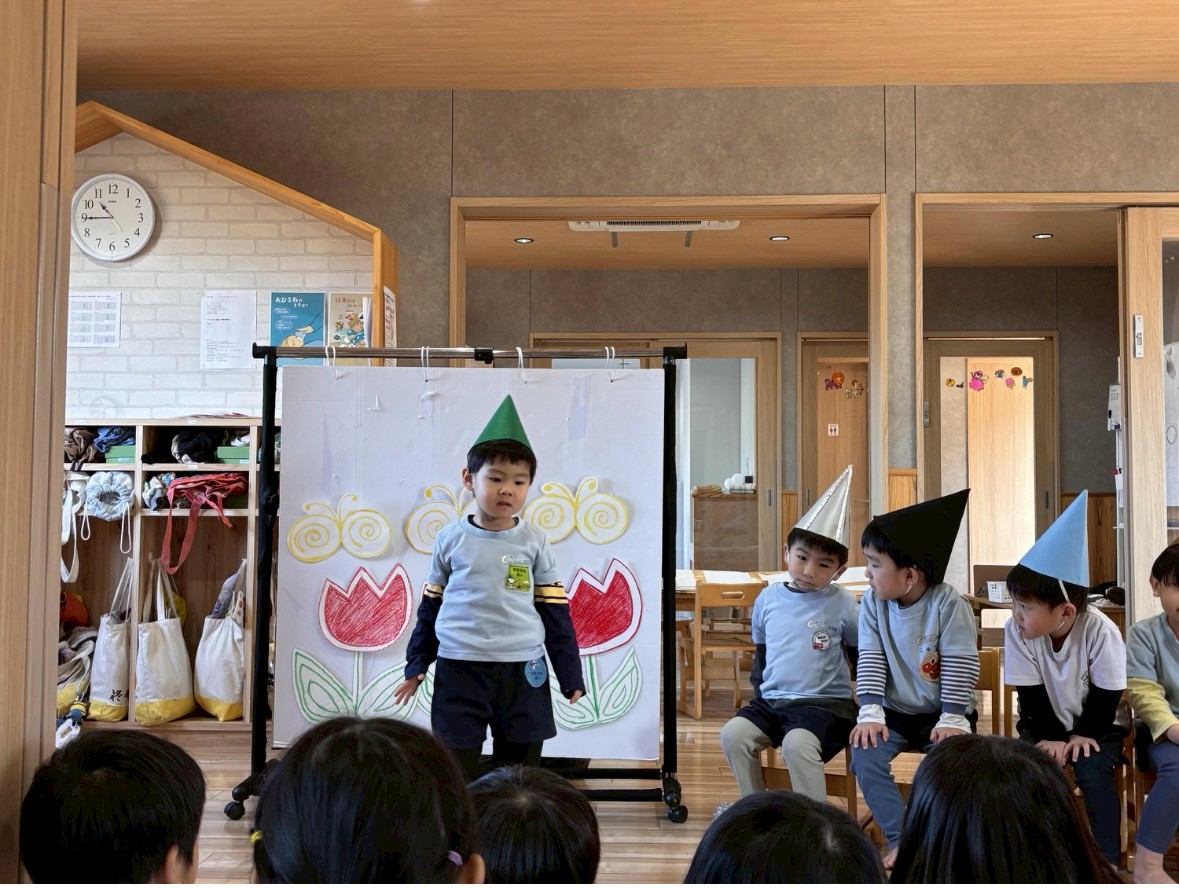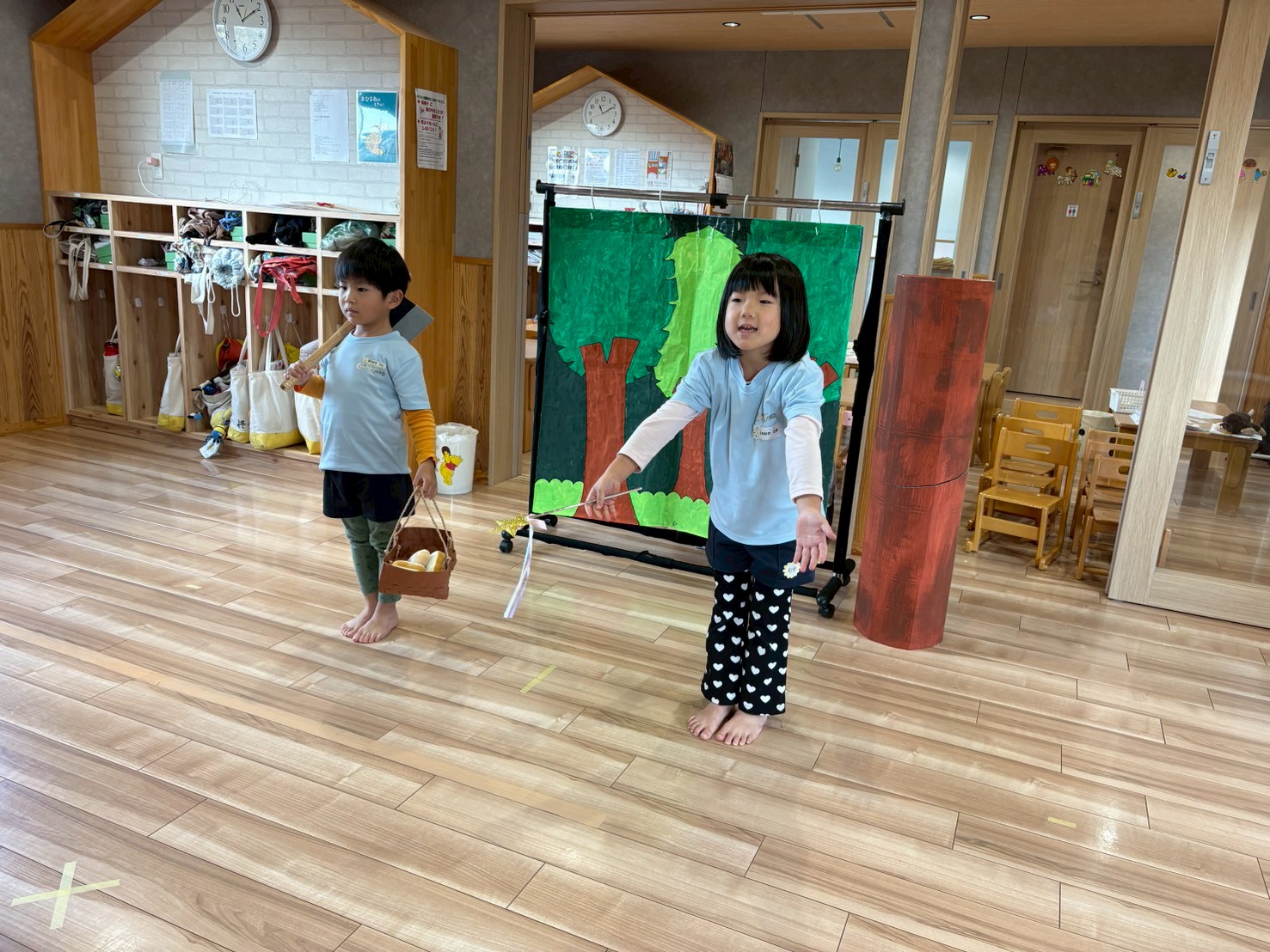 こあら・きりん組では、欠席の園児がいたものの、ペアの子がしっかりセリフを代わりに言うことで、流れを止めずに最後まで演じ切ることができました✨