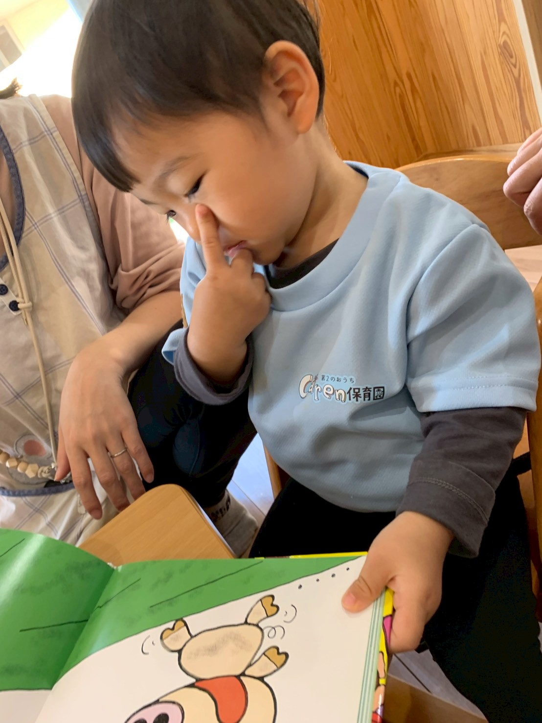 今日は朝の会の前に「たべてあげる」という絵本を見ました😊ちょっぴりドキドキする内容に興味津々で静かに見ていましたよ🤭苦手な物も自分で食べないと!!という気持ちになったかもしれません😁