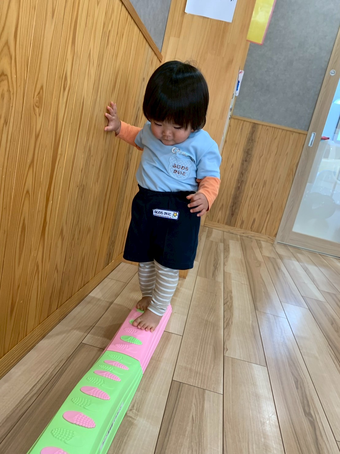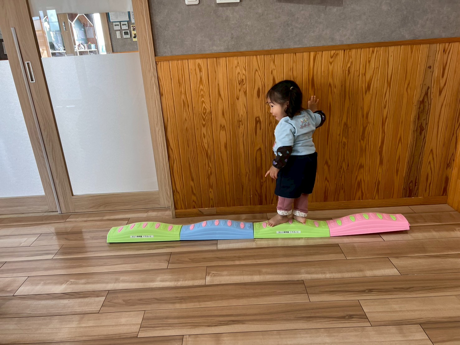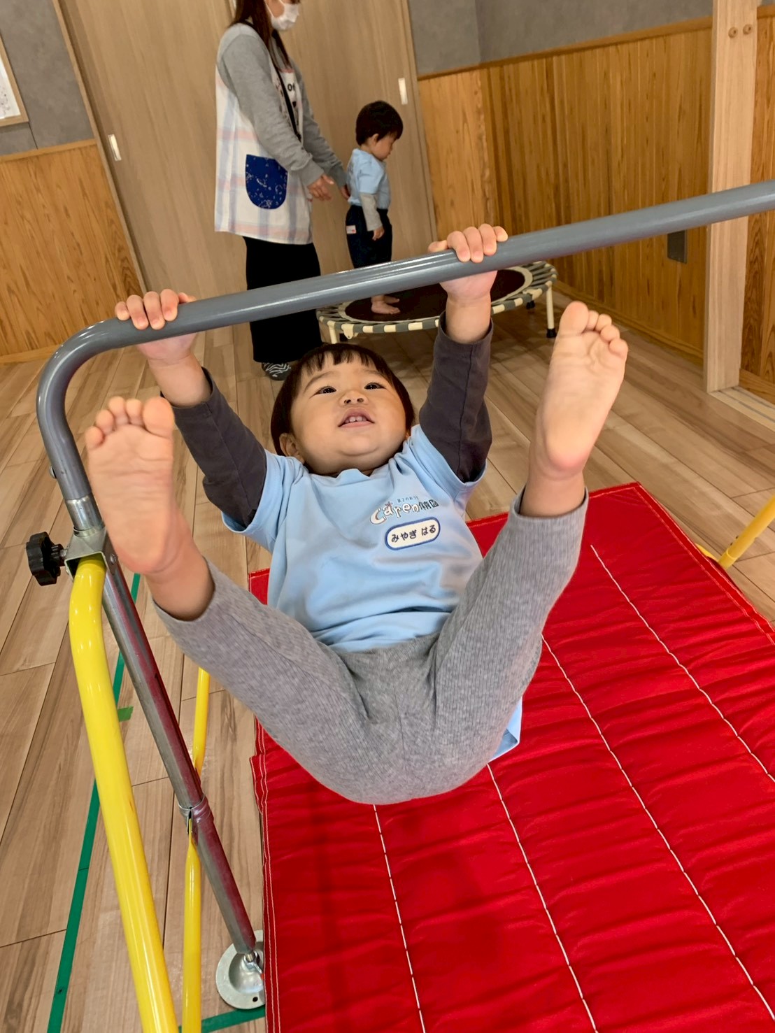その後はりす組さんのお部屋でサーキット遊びをしましたよ😃平均台やトランポリン、鉄棒など、りす組さんを真似、「順番、順番」と言いながら遊びました😄