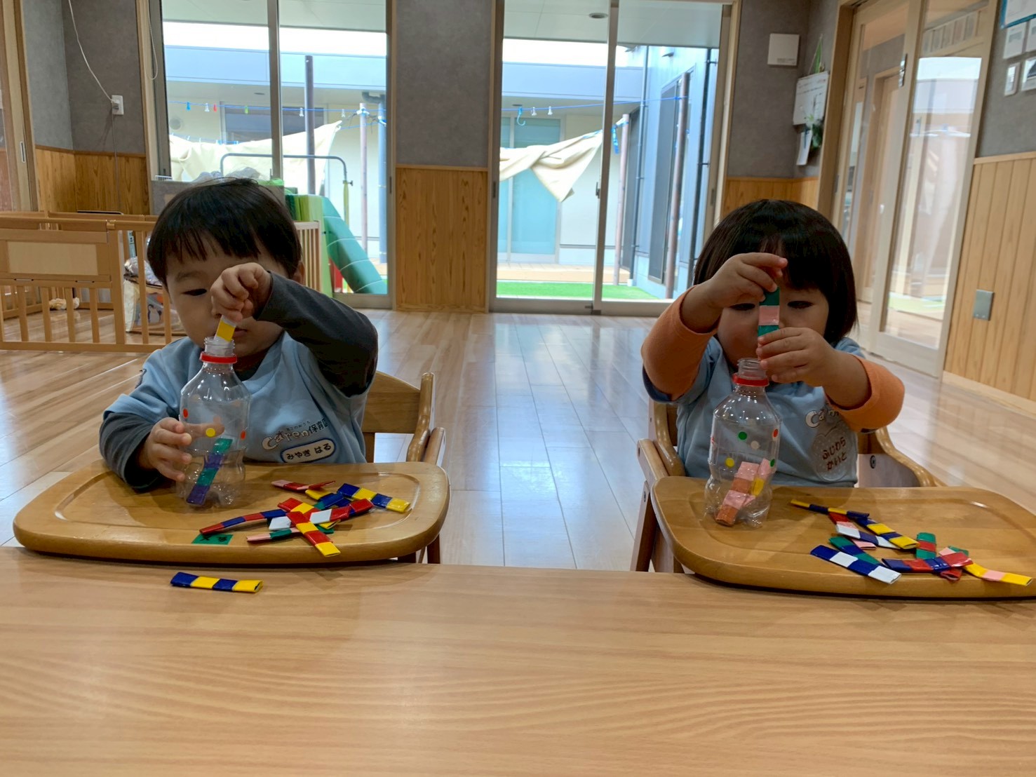 今日は指先遊びのぽっとん落としをしました。ストローやキャップ、フェルトボールやスティック、星型といろいろな形や素材を穴の大きさに合わせてポットンと落として遊びました😊しっかり指先でつかみ押し込んでいましたよ❣️