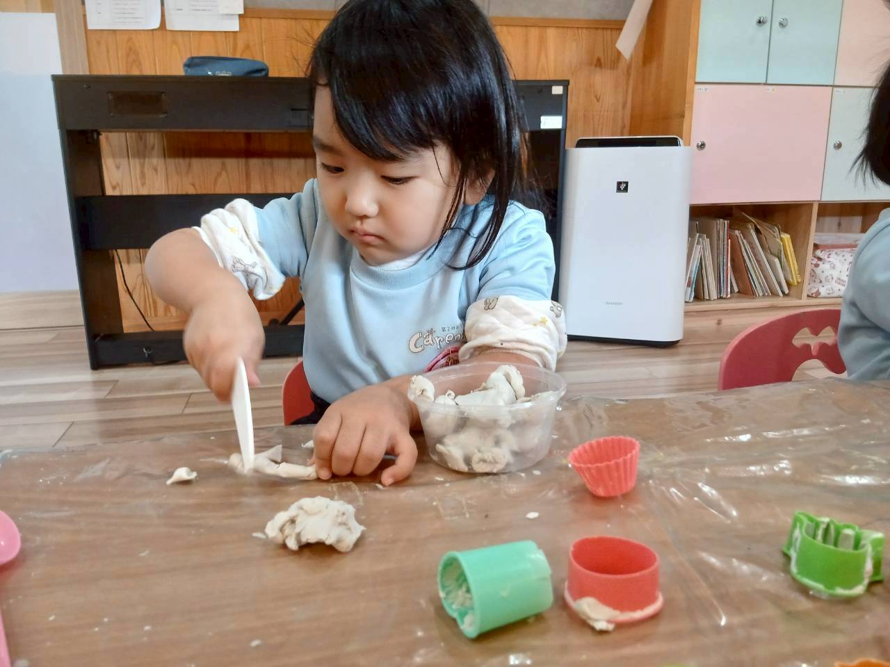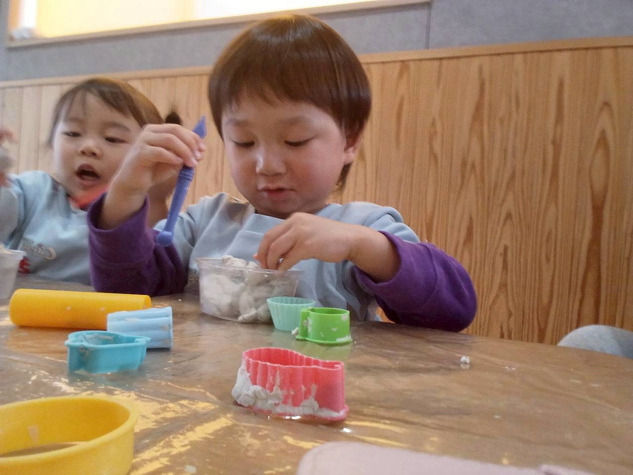 英語教室の後は大好きな粘土遊びをしました。小さなカップに粘土をいれてカップケーキを作るお友達、長く伸ばしてアイスクリーム🍨を作るお友達、型抜きで動物やドーナツを作ったり粘土ベラを使って切ってみたりと様々な遊び方をして楽しむ事ができたぱんだ🐼ぐみさんでした😆